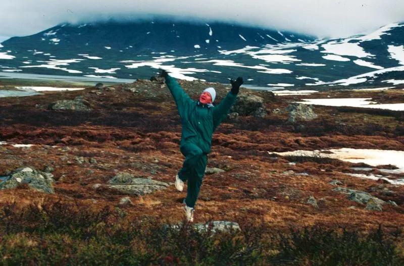 Angående TERRA INCOCNITOS blogginlägg om hoppande fjällvandrare så kände jag mig tvungen att visa denna egenhändigt fotade bild föreställande en kamrat i ett disigt Sarek som, just det, HOPPAR: