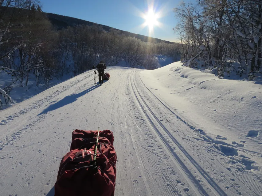 Från Bruksvallarna fortsatte vi i fortsatt kallt högtrycksväder. Den befarade spårlabyrinten upp och förbi Ramundberget visade sig vara tämligen lättnavigerad med perfekt preparerade spår för löparskidor. Med turskidor och pulka fick det bli skatespåren men dessa var platta och perfekt preparerade de med.