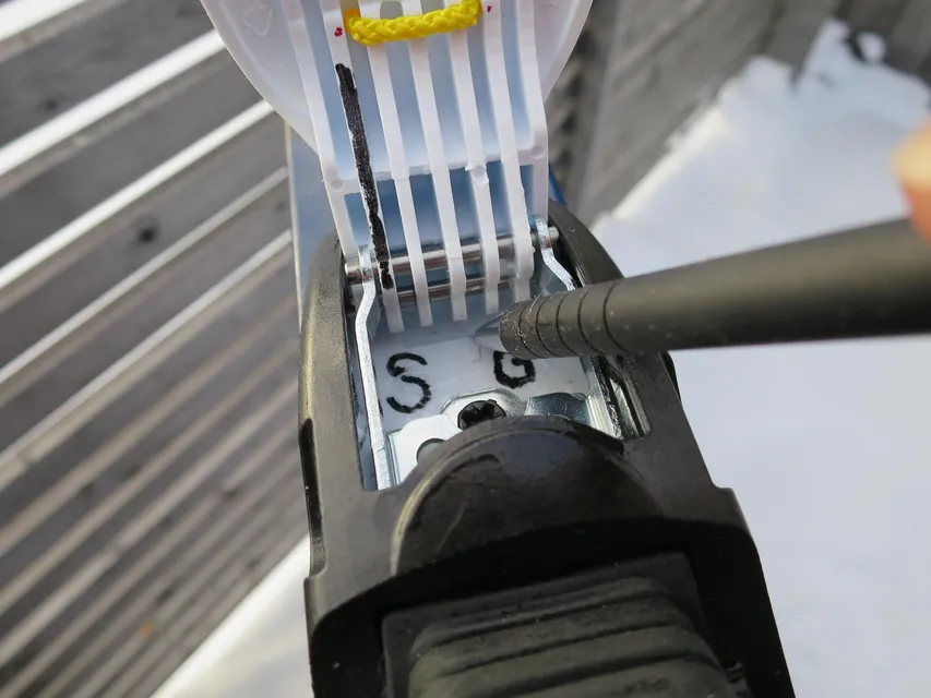 I Undersåker blev det dags att bottna ett problem som jag har haft med det par skidbindningar jag nyttjar just nu. Använder Rottefella NNN BC manuell på alla mina turskidor och de funkar fint nästan jämt. Men som säkert fler märkt så verkar inte Rottefella ha helt koll på toleranssättningen. Eller så tänker de kanske att bindningarna skall glappa lite för att minska risken för frysning? Vad vet jag? Resultatet är dock att de kan vara lite olika tröga att öppna. Dom som sitter på skidorna nu tillhör absolut det trögare sällskapet. Och tröga bindningar strular mer har jag noterat, och problemet ökar i kyla, vilket det ju funnits rätt gott om på denna tur, tyvärr. På både denna och förra etappen noterade jag hur ena bindningen blev svårare och svårare att öppna, trots rensande medelst liten skruvmejsel. Crescendot blev lägligt nog i Undersåker då det bara var promenad kvar till boendet. Plötsligt gick det inte att öppna bindningsuslingen alls. Så jag gjorde något som jag i det längsta skulle undvika på fjället, jag tog fram en termos och hällde ljummet vatten (hetvatten + snö) på eländet. Kom loss direkt såklart. Men ljummet vatten blir nästan bums kallvatten som nästan bums blir is. Så efter det kunde man varken öppna eller stänga bindningarna. Men vi var ju framme som sagt så de fick tina och torka i duschen. Googlade problemet och både forum och AI tyckte att silikonspray var lösningen. Verkade plausibelt. Troligen någon av metalldelarna som i kylan frusit ihop? Som tur fanns en K-bygg nära och sprayen inhandlades. När jag sedan stod och spraybehandlade skidorna insåg jag plötsligt vad problemet är, _egentligen_! Sprayen gör ingen skada men den löser inte grundproblemet. För se, när man öppnar bindningarna så skrapar framänden på den vita öppningsflärpen i botten på bindningen. Och som ni kanske noterat så finns det ett litet ”knäpp” som känns när man öppnar bindningen helt? Detta knäpp uppstår när flärpen glider över en lite klack som är ingjuten i botten, syns på bilden nedan.