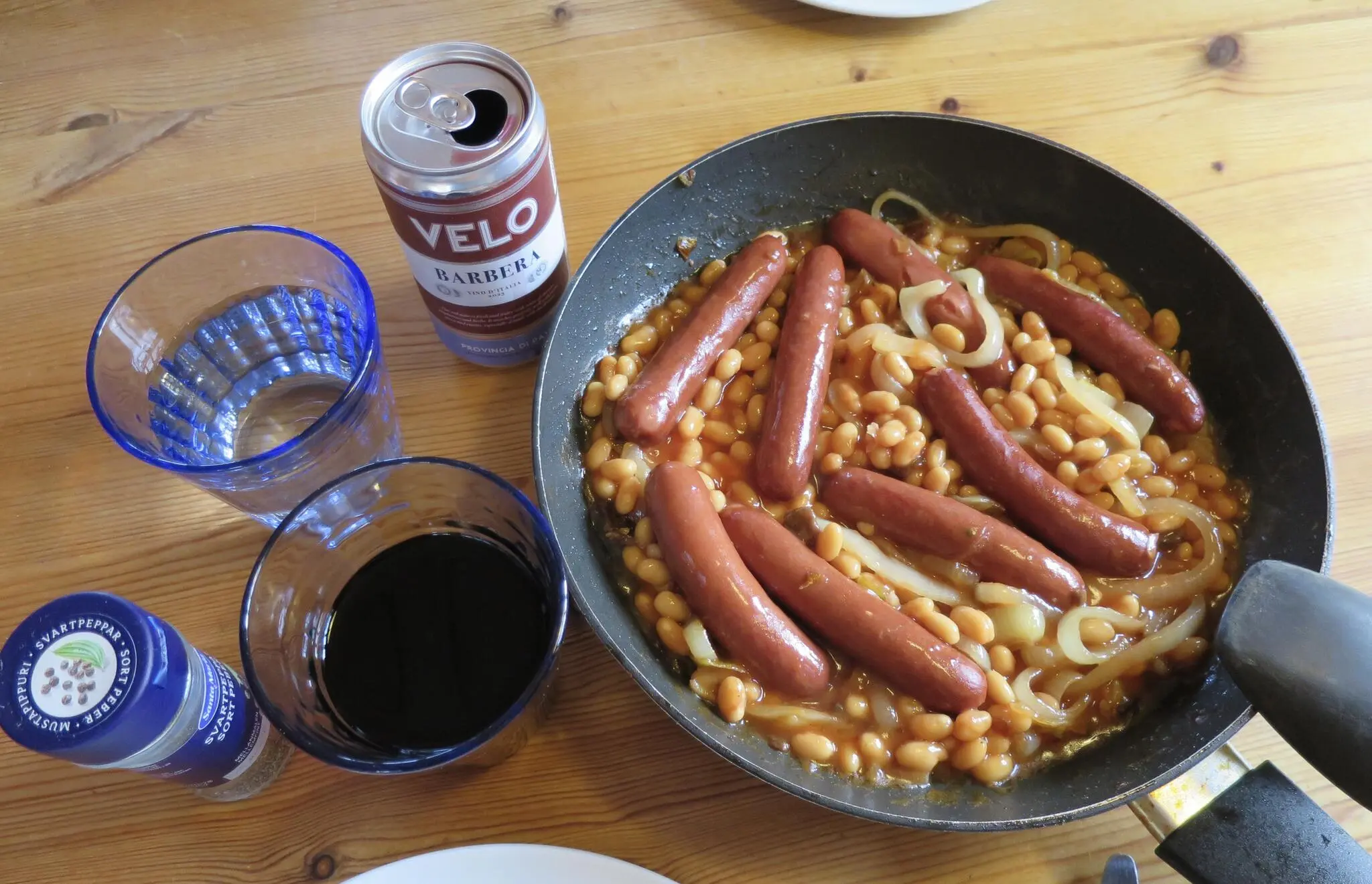 På de flesta depåstopp har det funnits affärer att handla i. Jänsmässholmen, Årrenjarka och Nikkaluokta är nog undantagen? Så vad äter man till middag om man måste förbereda middagsmaten några månader innan och vill slippa torkade röror och pasta? Stekt lök, bullens pilsnerkorv och vita bönor såklart! En klassiker som ackompanjerat med ett glas rött blir en riktig festmåltid! :-)