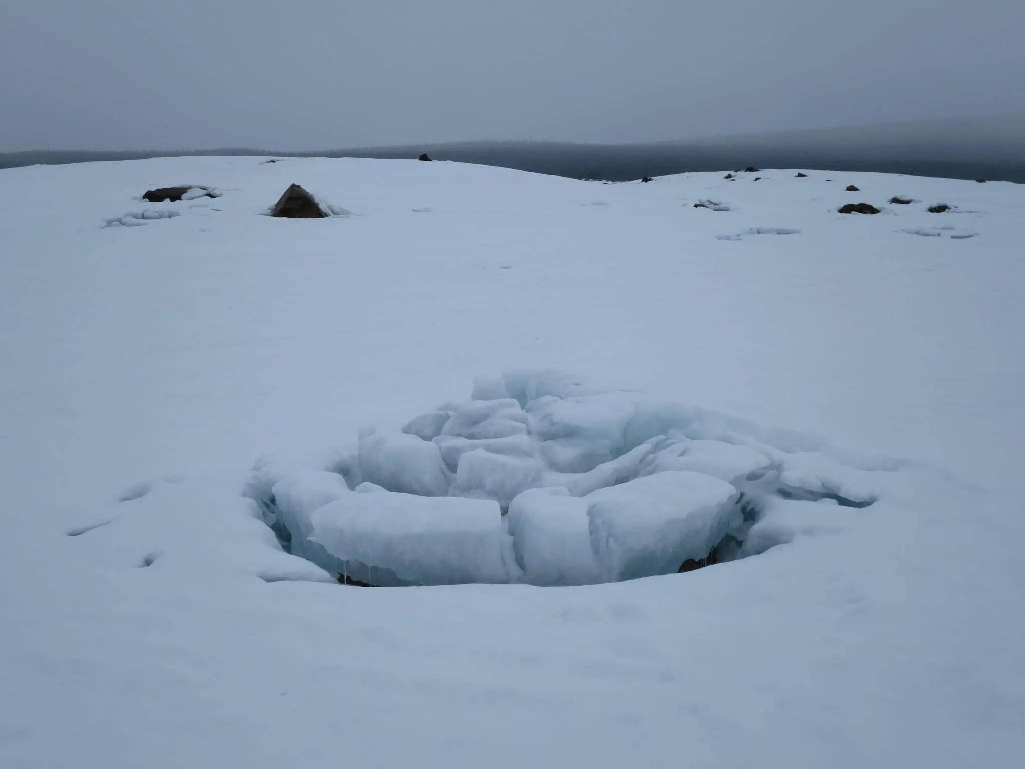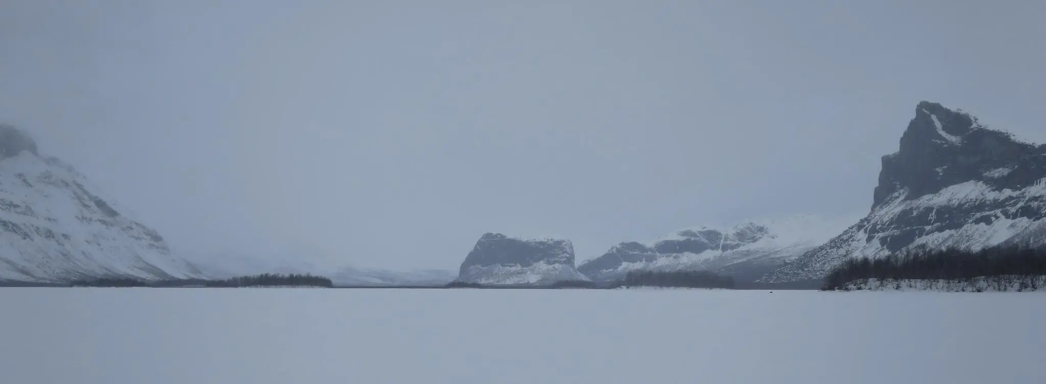 Nästa dag var mulen och blåsig och började med en passage av den extremt reglerade/punkterade sjön Tjaktajavvre. Vattenytan här regleras hela 35 m vilket i praktiken tömmer hela övre halvan av sjön. Lätt bisarr syn men stenar på botten skapar vackra isrosor i två-meters klassen när de krossar det sjunkande istäcket underifrån.