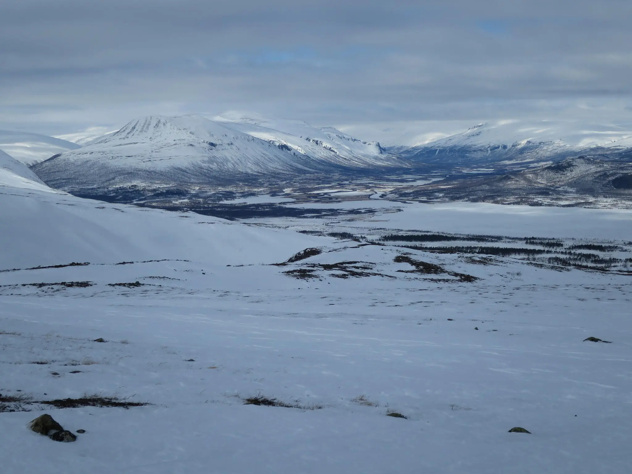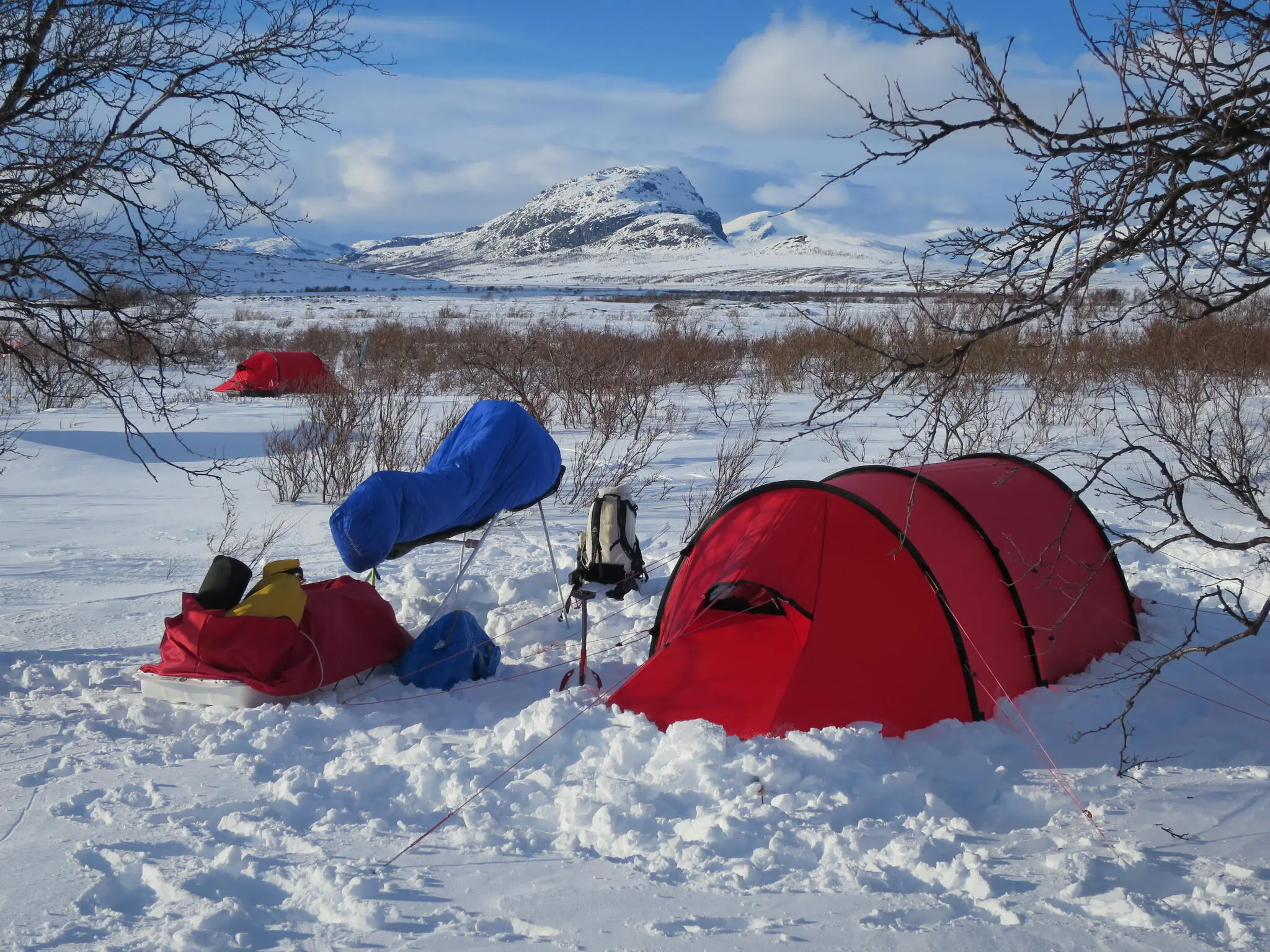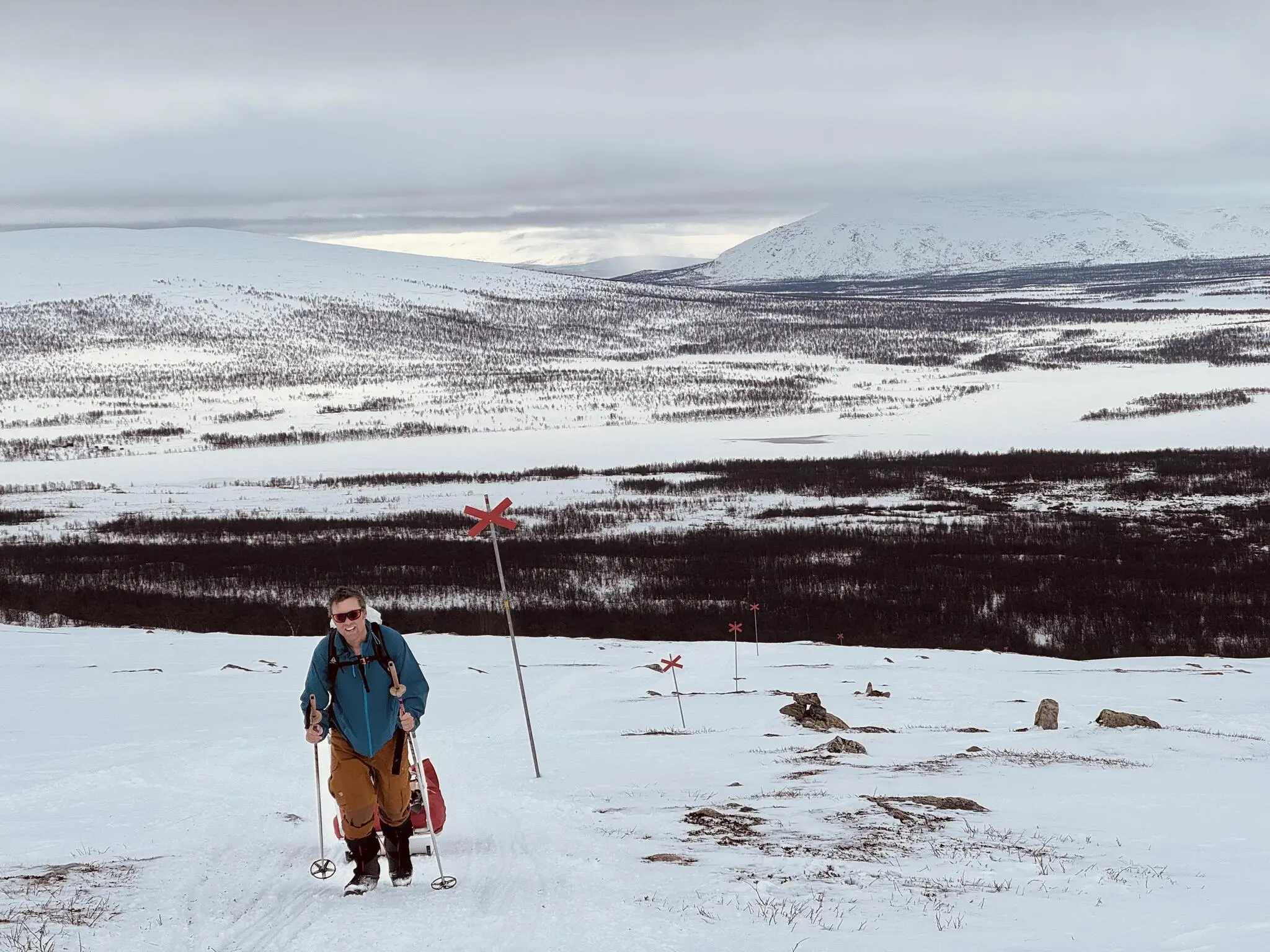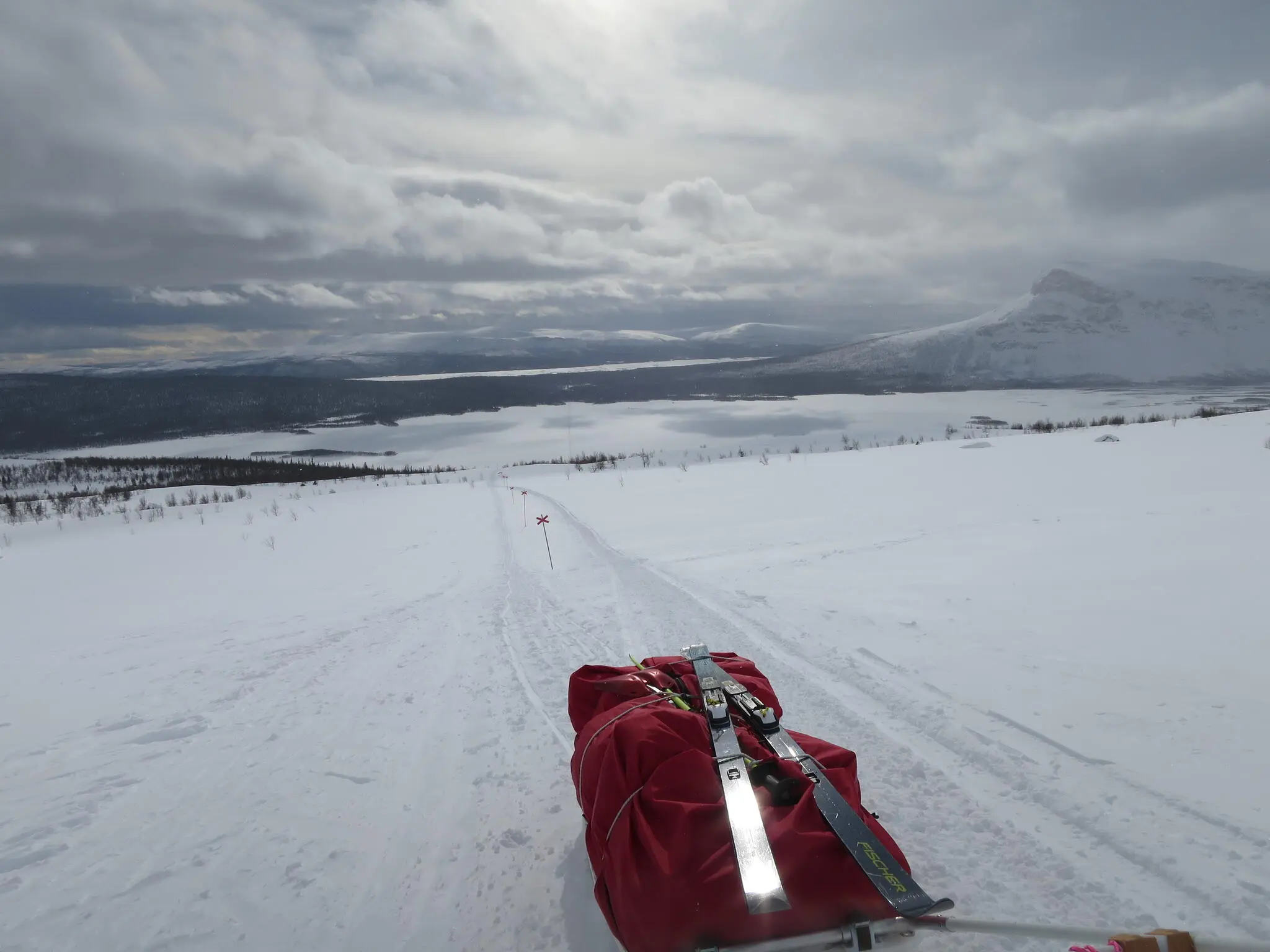 Varannandagsvädret fortsatte så det var dags för en mulen himmel igen när vi fortsatte på den för skidåkare lite mer sällanåkta leden som går nästan helt rakt norrut mot Nikkaluokta. Efter en tältnatt passerade vi den exklusiva fiskecampen Tjuonajokk vid Kaitumälven. Känns som ett ställe man inte passerar så ofta bara så där. Men det var faktiskt bara ett drygt halvår sedan Sisco och jag hade vägarna förbi sist. Då hade vi burit våra packrafts från Vakkotovare upp till källsjön Kaitumjavvre för att paddla Kaitumälven. Isättning typ nedanför STF stugan. Hela turen inklusive bärningen tog en vecka och vi lyckades paddla hela älven till dess att den förenas med Kalixälven vid E10an i Lappesuando. Mkt fin tur med många forsar. Kul också att börja på kalfjäll och paddla sig ner genom alla naturtyper till den täta tallskogen.