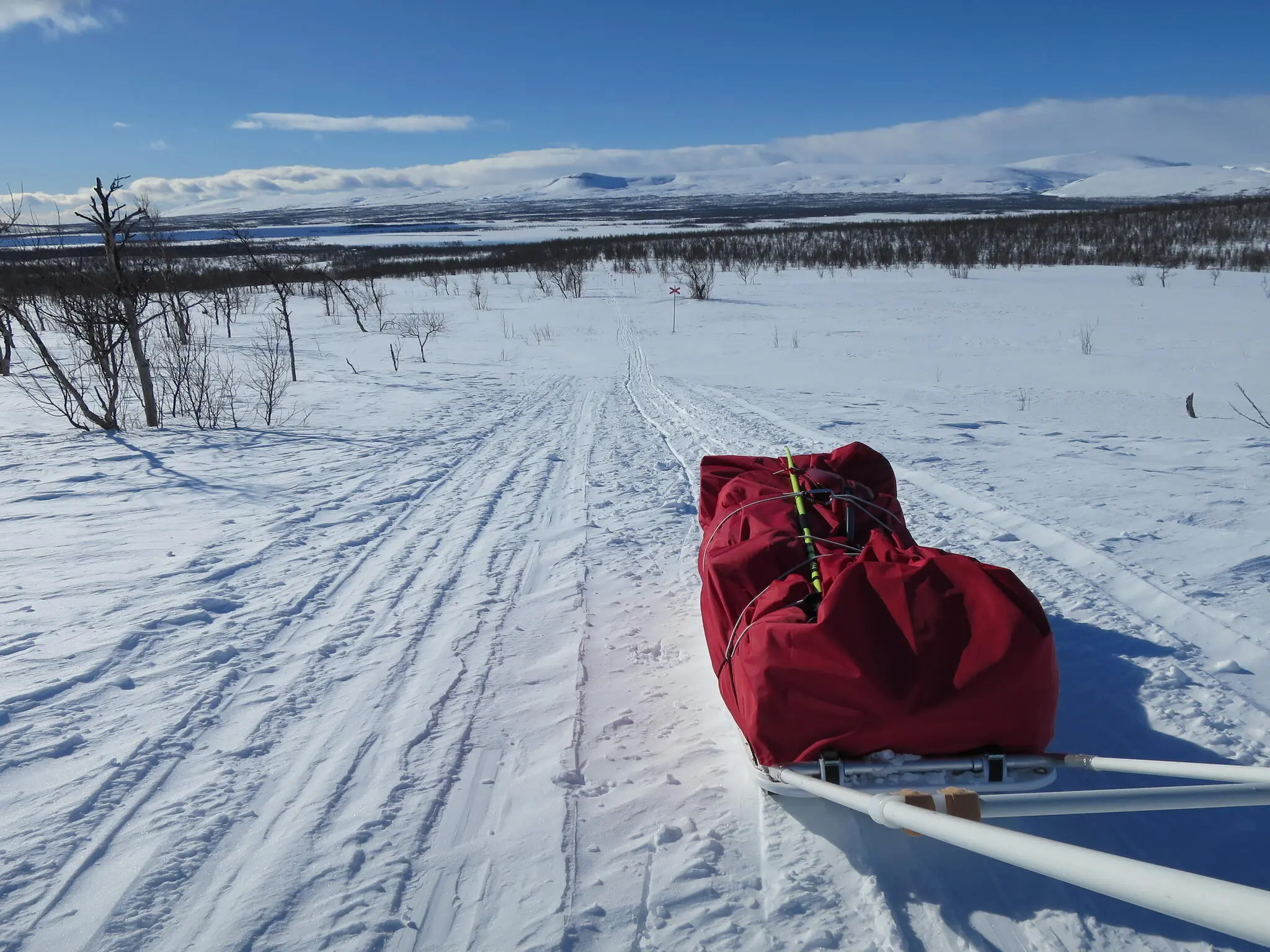 Skidan då? Den som Karin postade. Kom den fram? Nä, tyvärr inte. Missad omlastning i Luleå gör att den inte kommer fram förrän efter att vi lämnat Nikkaluokta. Så jag beställde retur av den försändelsen. Men ingen fara på taket, jag har ju skidan jag fick köpa i Saltoulokta och behöver inte en till reservskida. Stoppa pressarna! Efter detta skrevs KOM faktiskt skidan fram och levererades till dörren av Sarris servicemindade personal! Nu behövs den som sagt inte egentligen. Men orkar inte strula med retur härifrån så det får bli två reservskidor på pulkan. Kanske ngn annan har behov?