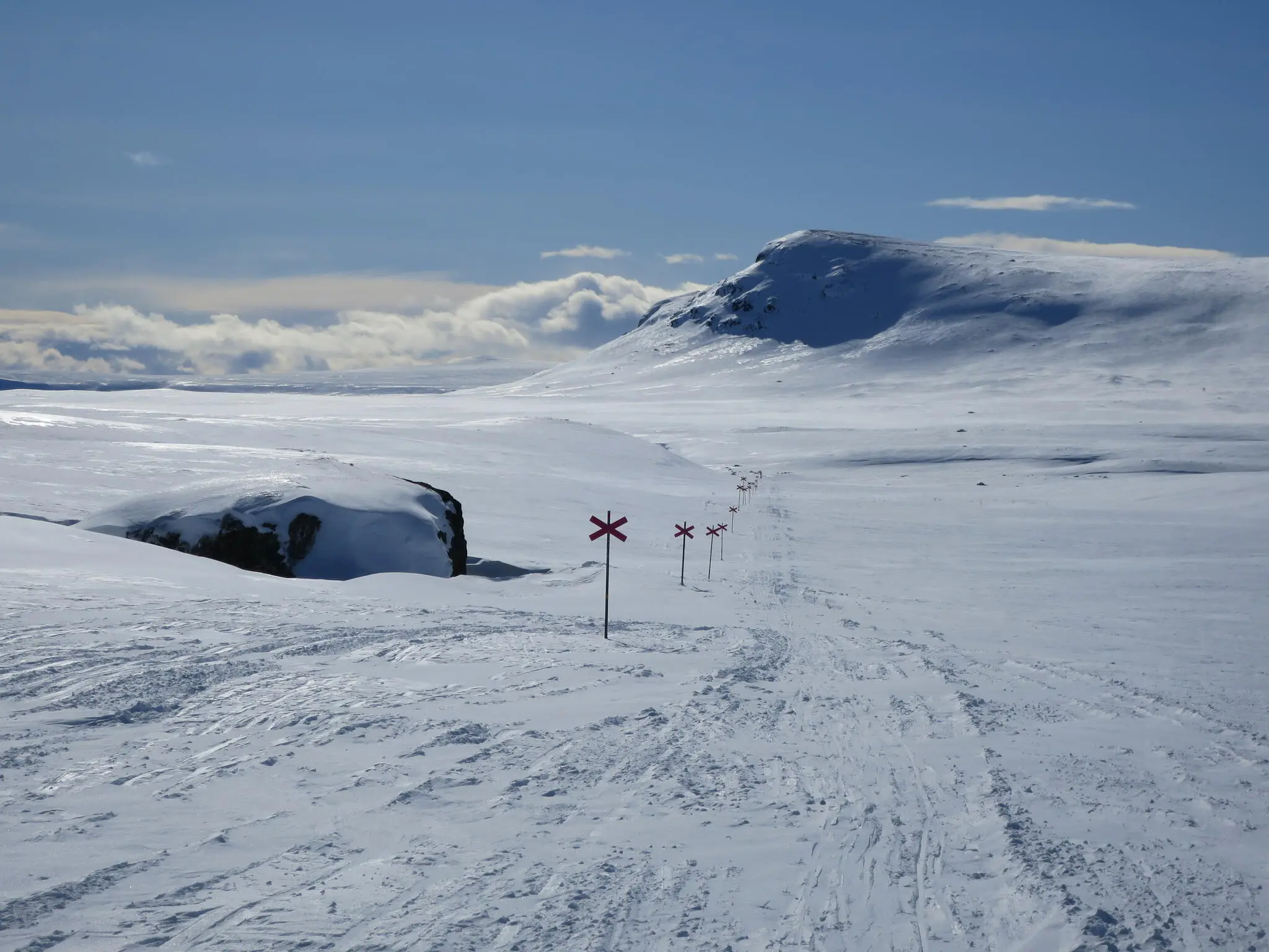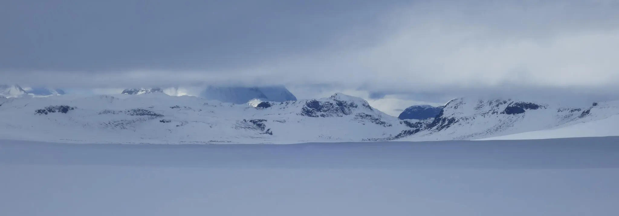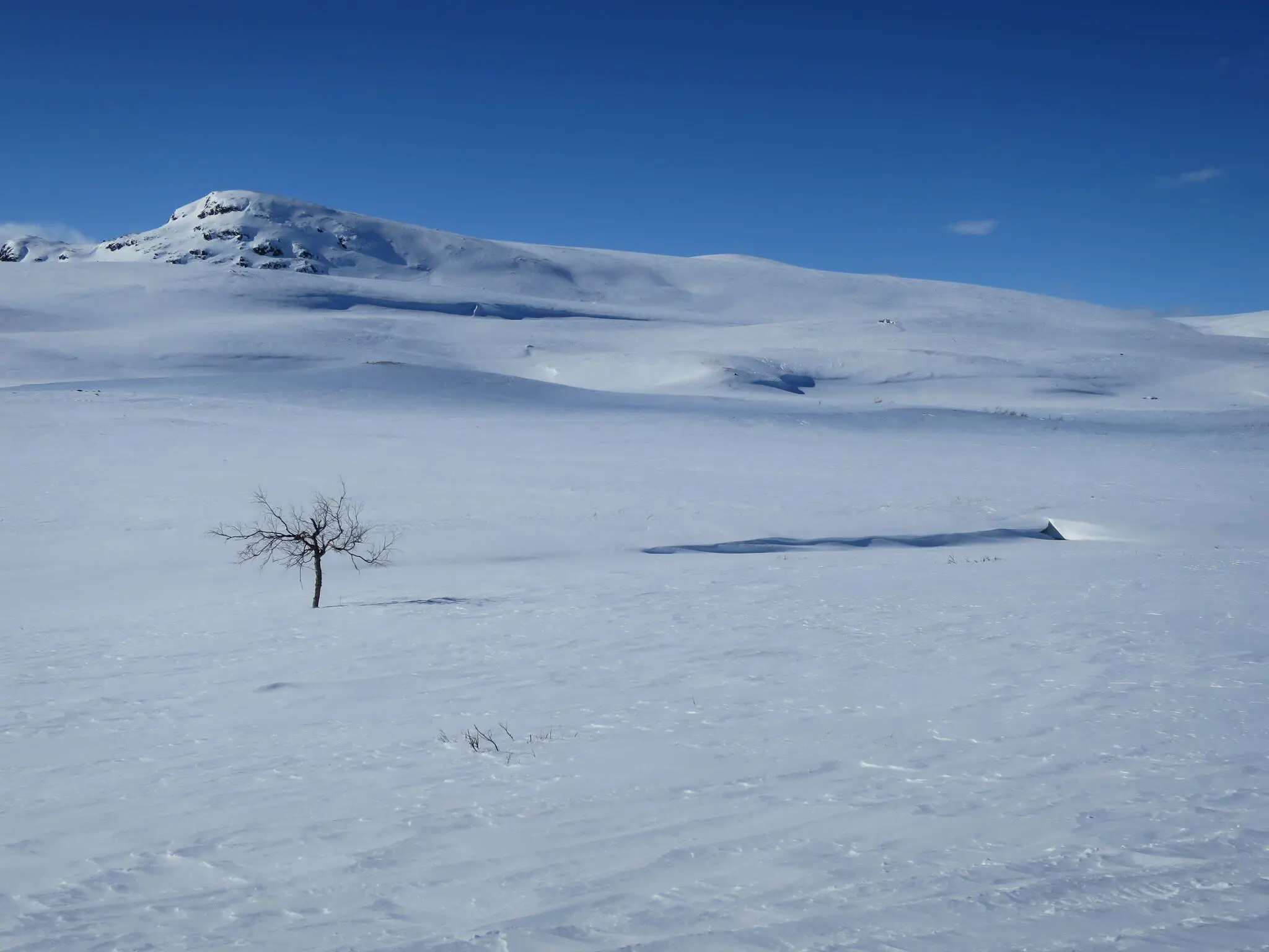 Men även om kvällen före avfärd från Årrenjarka var en gastronomisk höjdare började etappens första skiddag i moll. Jag kollar igenom utrustningen vid varje depå. För skidorna handlar det mest om att nagelfara bindningarna, sitter skruvar, etc? Men hade helt missat att ena skidan delaminerat i bakkant. Inte bra!!! Skidan konstaterades dock åkbar så jag gav mig iväg västerut på sjön mot Kvikkjokk och Kungsleden norrut. Sisco hade mer spring i benen och körde direkt norrut över berget Kabla. Men de 800 höjdmeterna lockade mig inte med maxfylld pulka (efter depåfyllningen) så min plan var att istället åka runt berget. Tidsmässigt samma och vi hade en plats på andra sidan där vi skulle ses efter två dagar.