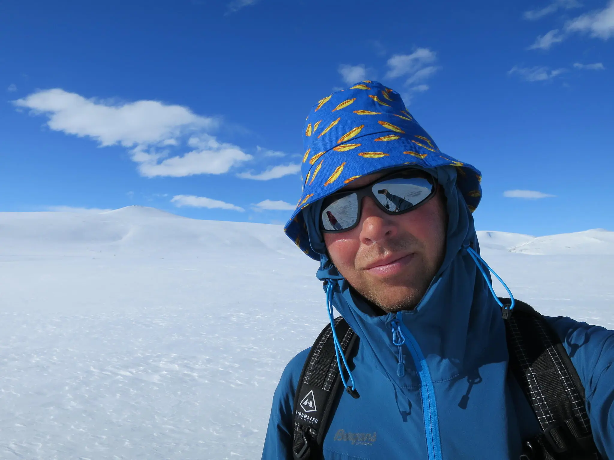 Solen var så bländande att korvhatt och solkräm fick kompletteras med uppdragen huva för skydd. Som tur var blåste det kallt hela dagen så inga problem med långärmat heller.