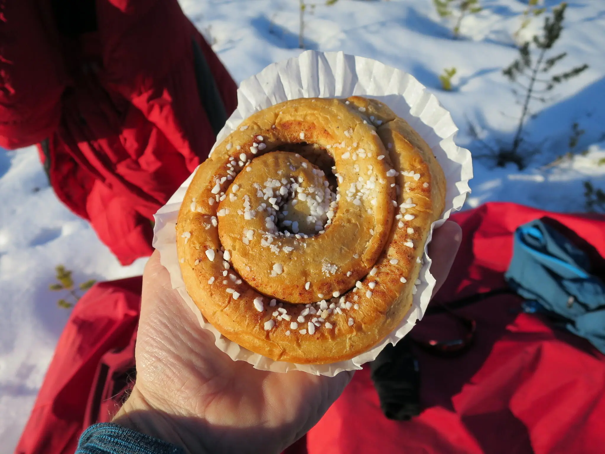 I Kirjaluokta tältade vi nära vägen och fick kärt besök av farbror med sambo. Jättetrevligt! Det är ju inte alla delar av släkten man träffar så ofta så desto roligare att ses när det blir tillfälle. Bjöds på både korv- och kanelbullefika där mängd och storlek passade en fjälltur perfekt. :-)