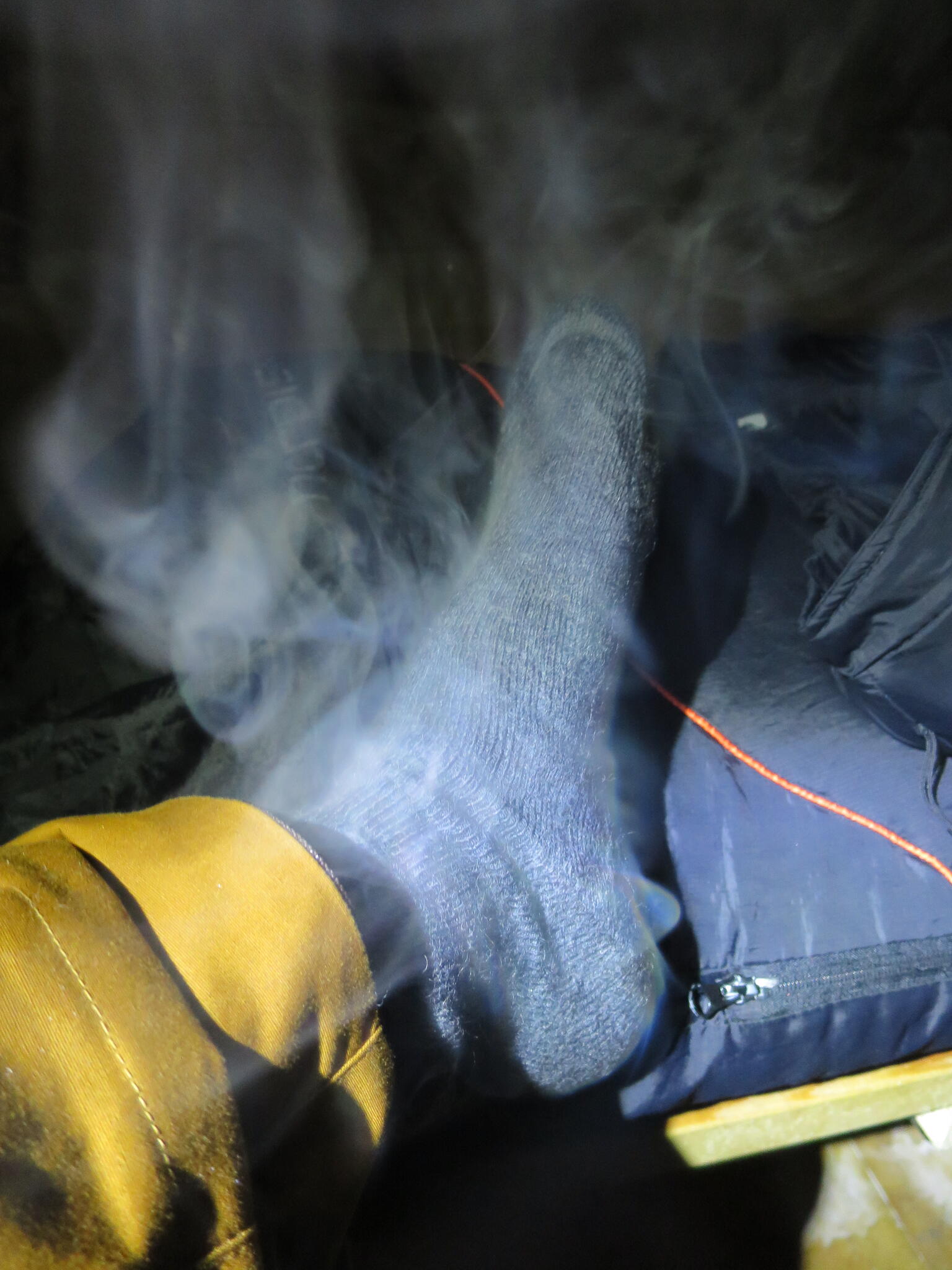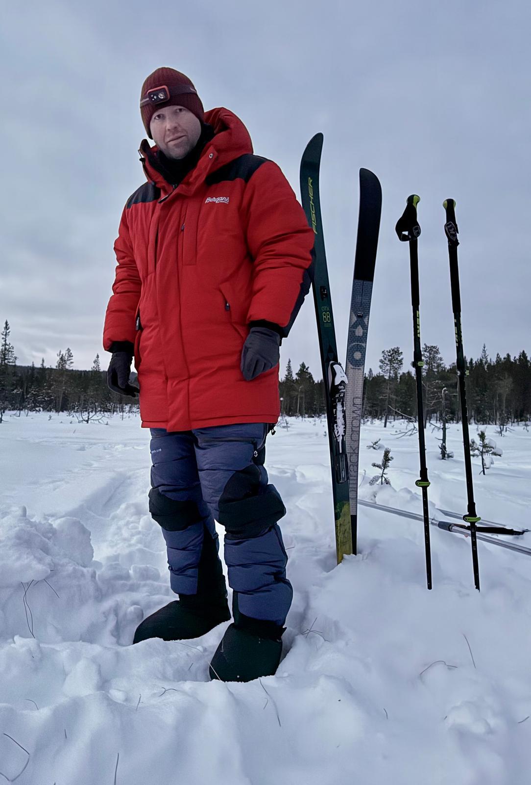 Hur klär man sig då på en skidtur som denna? Ja, det är såklart helt individuellt men för egen del har jag som standard 1-2 par långkalsonger beroende på temperatur under mina fjällräven byxor. Skalbyxor har jag själv svårt för precis som skaljacka förutom när det är svinkallt eller blåser mkt. Jag har tyvärr lätt för att svettas och skalkläder blir snabbt svettigt varmt. På överkroppen har jag istället ofta en mkt tunn jacka och 2-3 underställ och en T-shirt. Alla underställ, T-shirt och kalsonger i ull såklart. På fötterna ett par pjäxor med integrerad damask (Alfa Outback BC 2) som håller fukt borta från kängorna utifrån på ett mkt effektivt sätt. Kruxet är bara att den mesta fukten kommer från mig själv, fotsvett alltså. Så över innerstrumpan har jag en fuktspärrsocka (tänk plastpåse). Det gör att innerstrumpan blir sjöblöt av svett. Men ytterstrumpa och kängor håller sig torra och fina. Och när det är -27 på morgonen är det superviktigt. Blöta kängor som frusit till is kan både vara omöjliga att få på sig och ger lätt skavsår. De blöta innerstrumporna ser för övrigt spektakulära ut i låga temperaturer. :-)