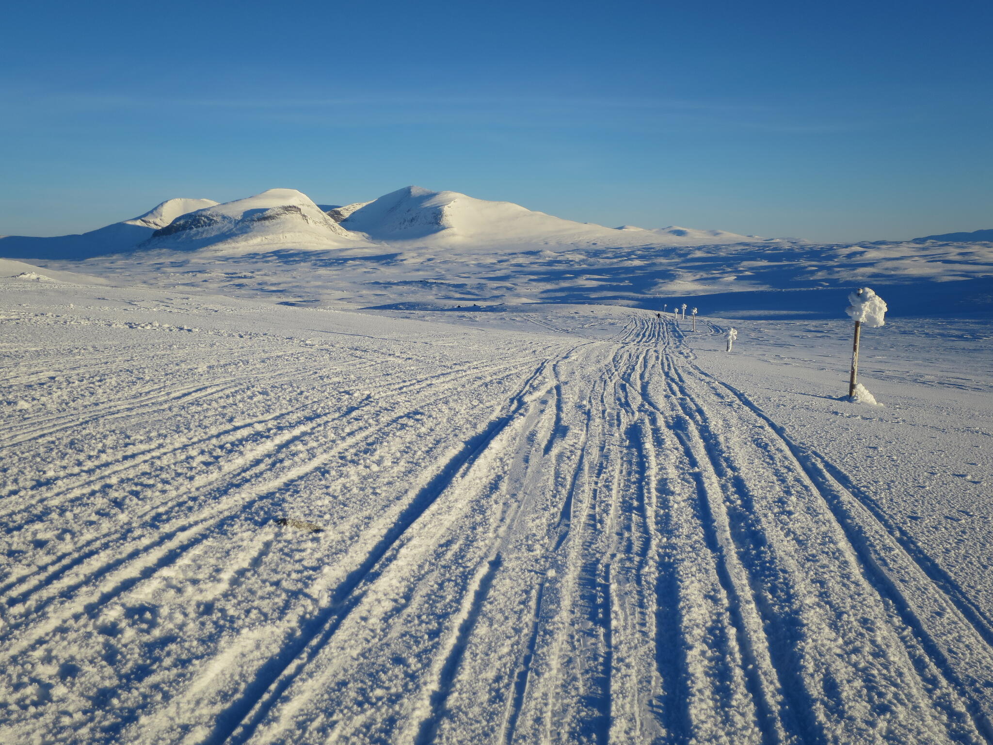 Från Bruksvallarna fortsatte vi i fortsatt kallt högtrycksväder. Den befarade spårlabyrinten upp och förbi Ramundberget visade sig vara tämligen lättnavigerad med perfekt preparerade spår för löparskidor. Med turskidor och pulka fick det bli skatespåren men dessa var platta och perfekt preparerade de med.