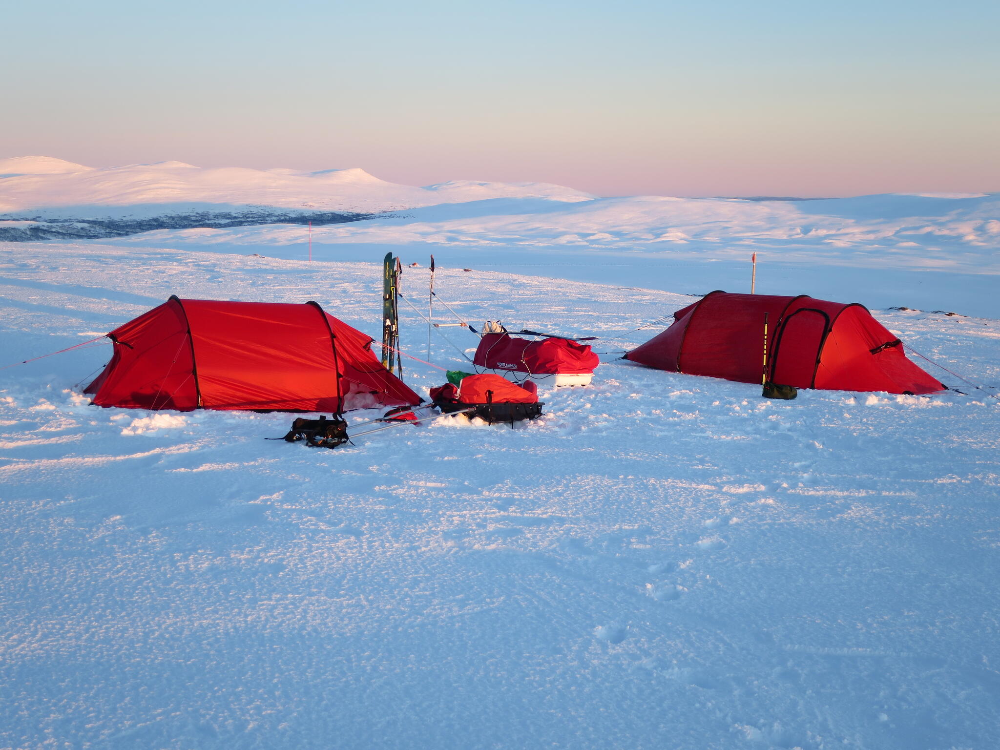 Andra natten på kalfjället blev spektakulär med milsvid utsikt på Helags östra utlöpare. Hade tänkt runda och undvika dessa onödiga höjdmeter med ett renstängsel i till synes bra skick satte stopp för den planen.