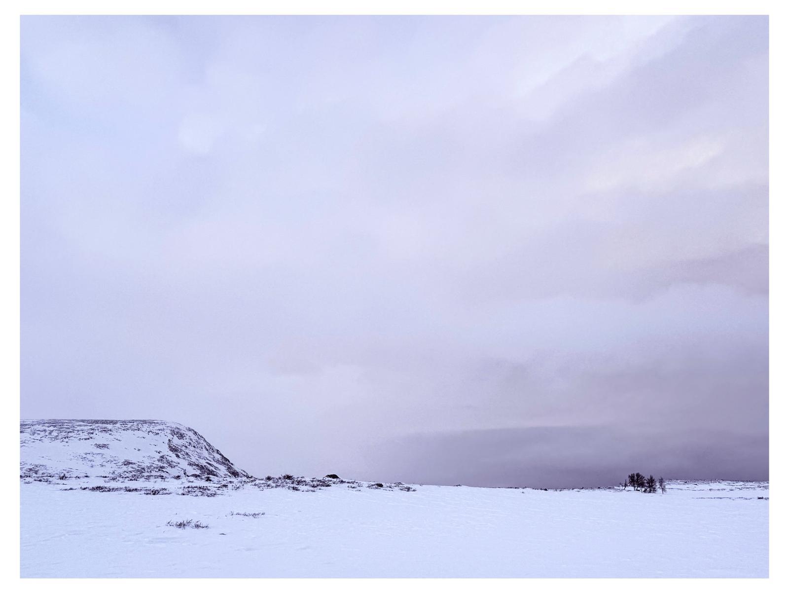 Sedan slog vädret tacksamt nog om. Blå himmel, snö och högtryckskyla är absolut vackert. Men också ganska tröttsamt och svårt att klä sig i. I läiga och soliga uppförsbackar blir det svettigt varmt. I skuggiga nedförsbackar jättekallt. Blev istället markant varmare, bara 6-7 minusgrader och mulet. Fortsatt lite vind och låg molnbas. Ganska typiskt fjällväder alltså. Normalt sett inget man suktar efter men nu var det rätt skönt, särskilt med den relativa värmen.