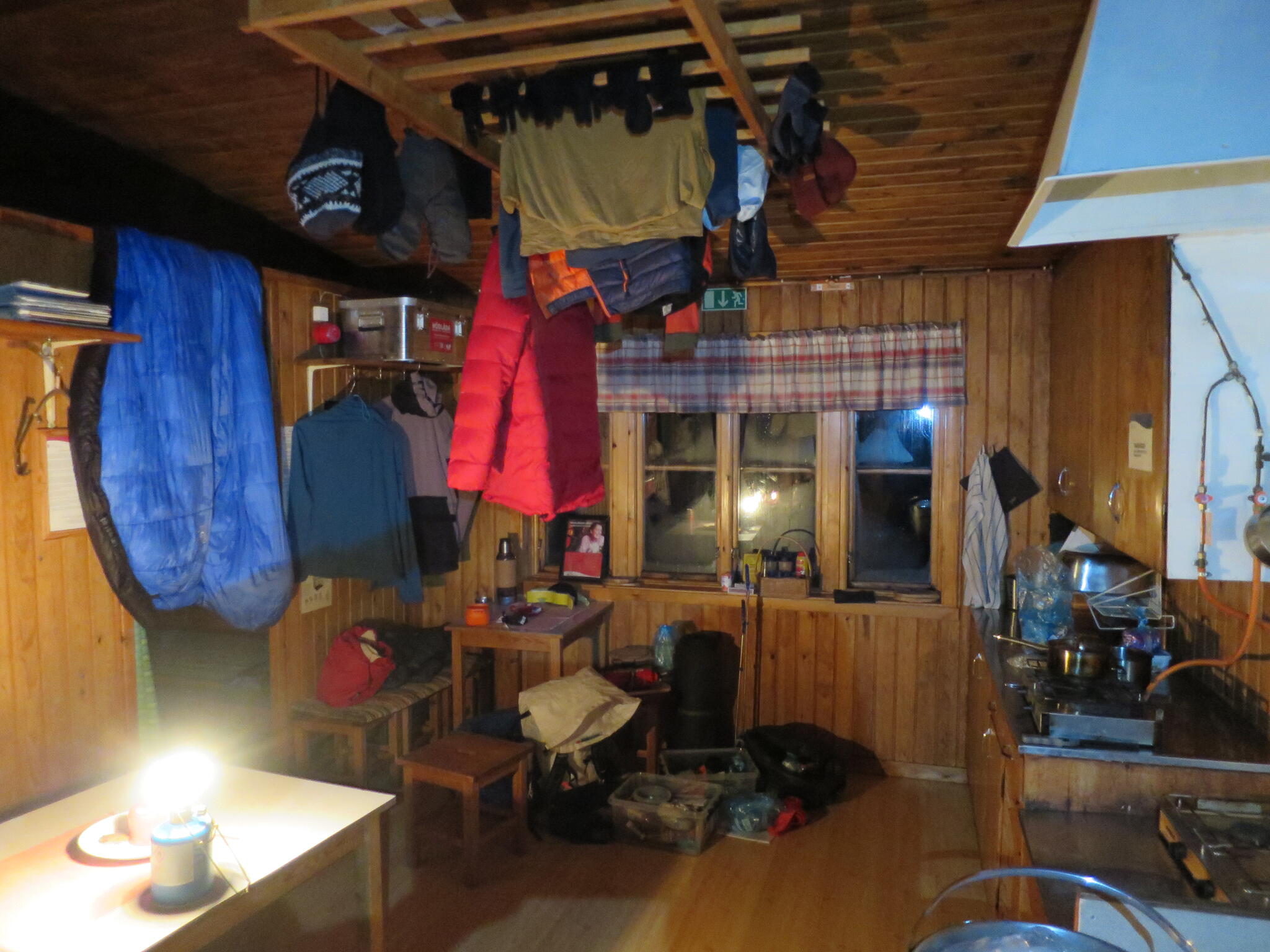 I övergången mellan kalfjäll och skog ligger Vålåstugan och den blev ett bra nattstopp för att torka sovsäck. Det är verkligen helt sjukt hur blöt sovsäcken blir i dessa kalla temperaturer. Efter en vecka med mer modesta temperaturer brukar säcken vara fuktig, men efter bara några nätter i -20/-25 så är den riktigt blöt. Vilket som sagt är ett väldigt olyckligt samband. Det sista man vill ha en kall natt är ju en blöt sovsäck. Och solen har inte börjat värma så mkt att den torkar tillräckligt heller. Åtminstone inte på morgonen. Får börja lägga ut säcken på tork på pulkan dagtid framöver om detta fortsätter.