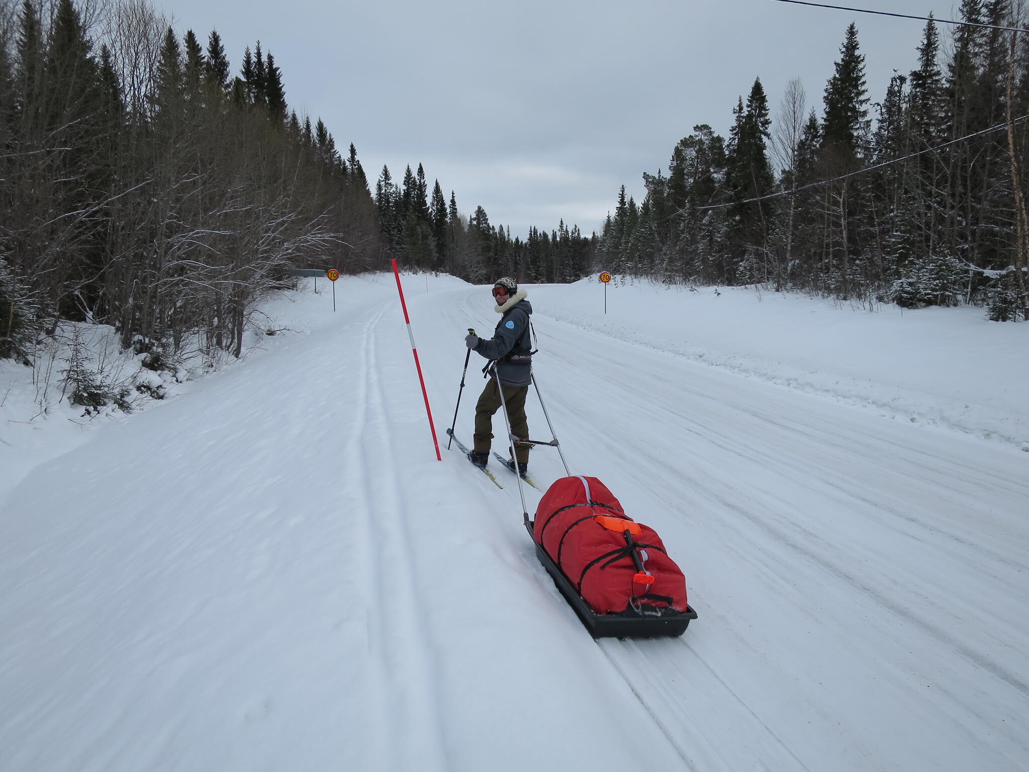 Skoterspåret till Vålådalen där vi tältade på en myr strax sydost om fjällstationen. Sedan vidare via Östra Vålådalen där vi noterade att bilvägen faktiskt hade en bra snösträng längs kanten som var åkbar nästan jämt. Så förutom några omvägar ut i diket kunde vi ta den till nästa skoterspår som vi bespetsat oss på istället för att ta omvägen via Ottsjön till samma spår. Inte den mest spännande åkningen längs vägen men lite poddlyssning piggade upp.