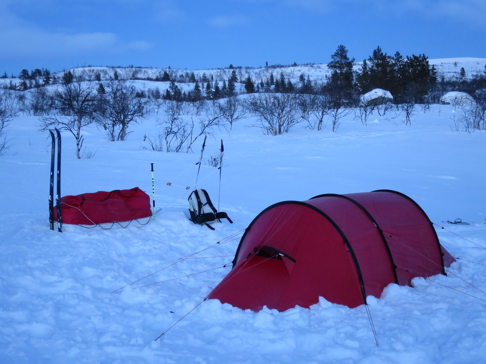 Fin tältplats på kvällen. Men det blev bara kallare och kallare. Själv tycker jag temperaturer till -15 är bäst, -20 bra, -25 OK och -30 bara jobbigt när man tältar. Sisco mätte -24 inne i sitt tält vilket rimligen innebar lite svalare än så utomhus.