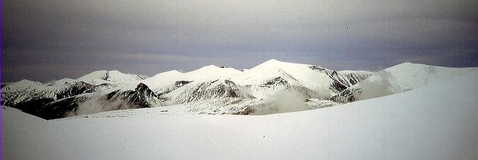 Utsikt från Påssustjåkka.1992.Panorama ut över Mårmafjällen; Från vänster till höger: Bogitjåkka, Vassatjårrå, Mårmatjåkka, Höktopparna, Vierratjåkka.