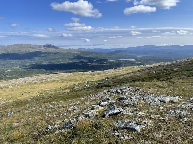 Efter en kort lunch fortsatte min vandring bort från leden och jag gick upp norr om Kyrkstenen mot Södra Kyrkstensskaftet. Detta var en rätt så brant bit och det fick mig att tydligt känna pulsen. Det fick bli många stopp där jag beundrade utsikten medan hjärtat lugnade ner sig. Plötsligt kändes inte de där 17.2 kilona så värst lätta längre.
