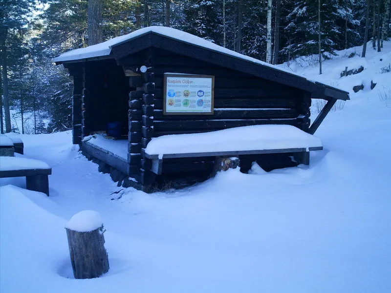 Klev av i klart väder och en temperatur på cirka -12, stötte genast på en vaktmästare av något slag, frågade efter snödjup längs bergslagsleden norrut. Inga problem....svarar han, vi har kört skoter en bit som du kan vandra på, resten får du pulsa. En lätt vandring fram till Mattsabacken, där blev jag tveksam, fortsätta på leden eller ta stigen längs Göljeån. Bestämde mig för stigen, följde den plogade vägen neråt, vek av in i skogen och pulsade fram till en startpunkt.