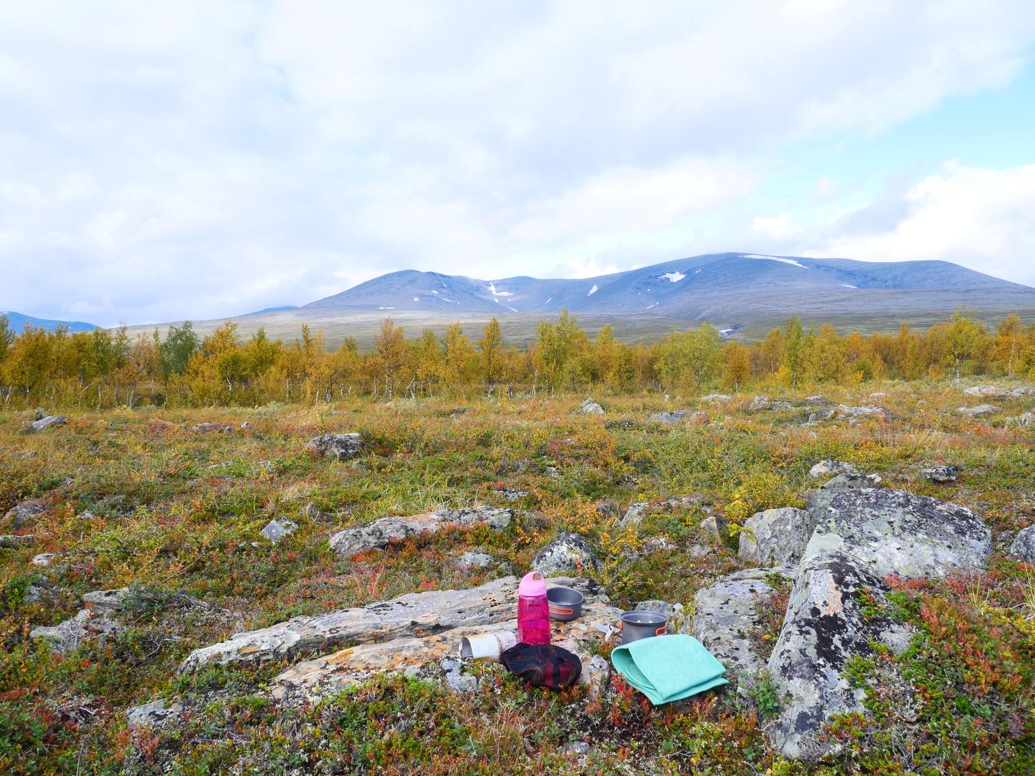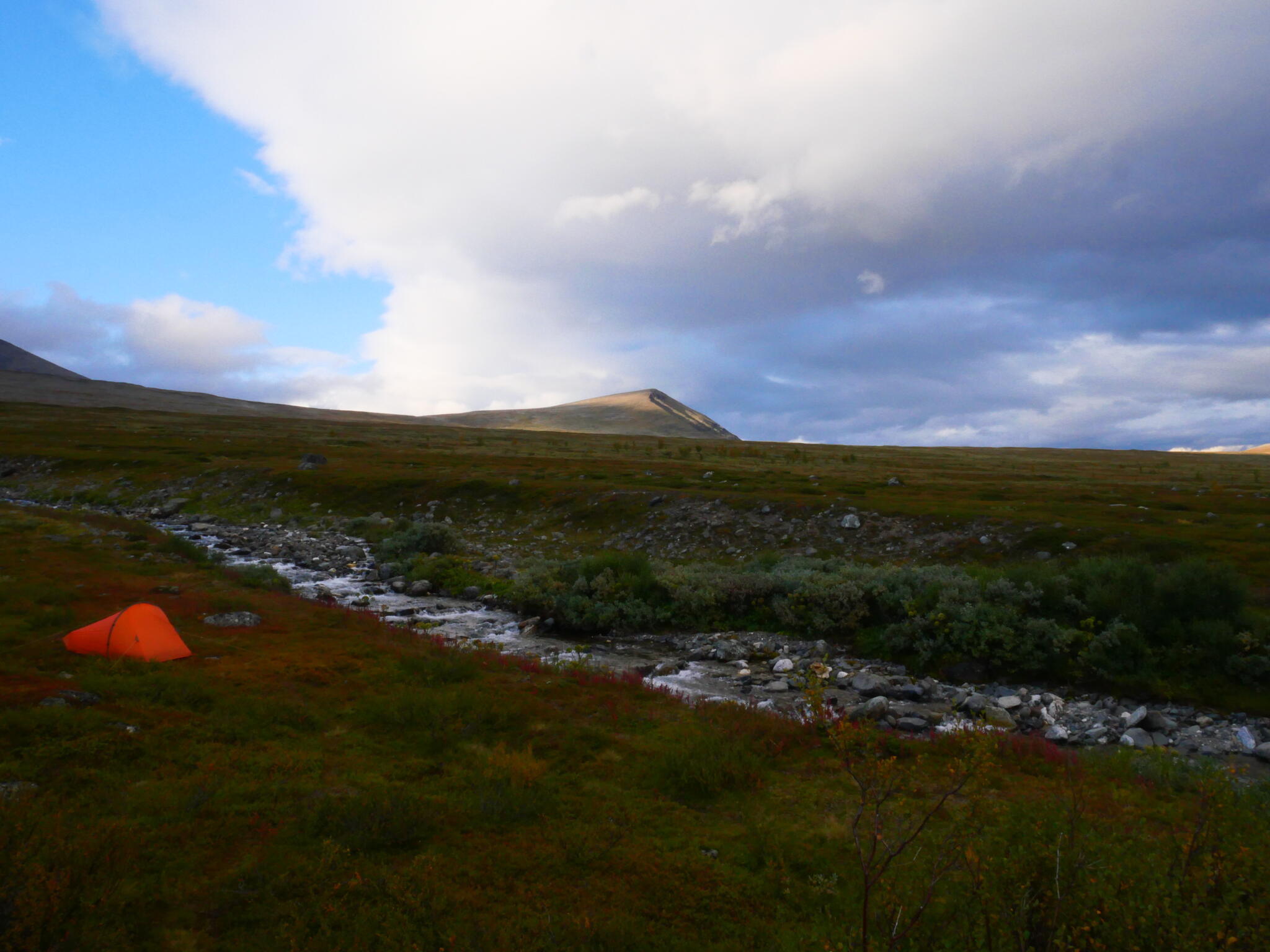 Jag såg att en annan person hade slagit upp sitt tält en bit högre upp nära vattendraget. Av respekt för den personen så stannade jag till där jag var och slog upp tältet så att det inte syntes från där det andra tältet var. Syntes det så var det inte mycket.