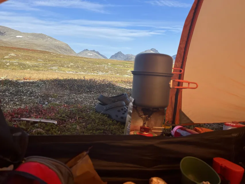 Solen sken utanför tältet när jag tog av buffen, och jag hade sovit med både mössa och dunjacka. Jag var lite imponerad över att jag vandrat i 3,5 dagar och inte kommit längre. Om allt hade fungerat som det brukar hade jag kunnat gå hit på en dag. Det var skönt att vara i fjällen, men det var på ett annat sätt denna gång. Dagens mål var hur som helst att komma lite närmare Rapadalen.