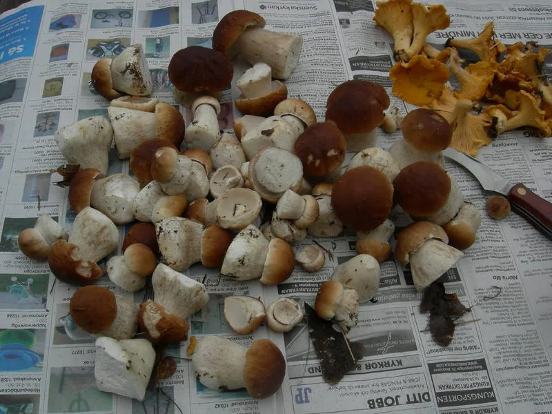 När jag kom till tredje lilla stället hittade jag först inte en enda guling men väl en hel hoper med tokfina små Karl Johan-svampar! Bara någon enstaka var förvuxen, nästan inga var angripna av larver, bara några var provsmakade av sniglar (tror jag) men det kan jag bjuda på. Jag plockade så många som min tunna lilla påse orkade hålla för, säkert fanns där fler om jag tittat lite till.