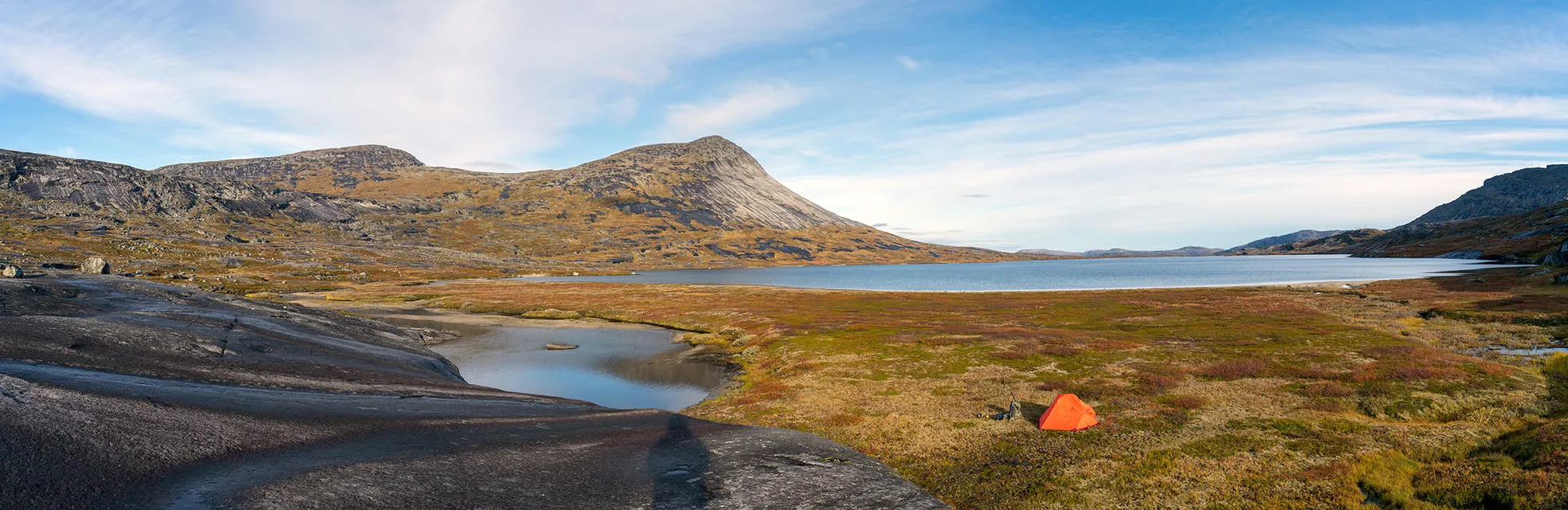 Gör en sväng upp på Rähtjátjtåhkkå för att fotografera Galbejávrre och Stibokjávrre. Fortsätter genom Ræhtjátvágge (Retgatdalen) tillbaka in i Norge.