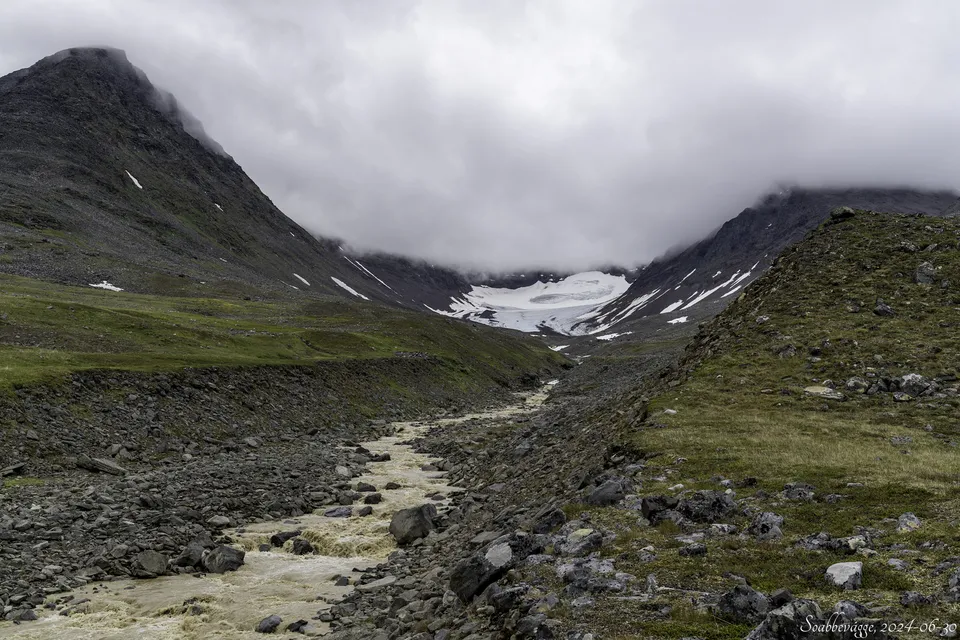 Jag börjar dagen med att gå upp i Soabbevágge i hopp om att molnen ska höja sig så att topparna syns. Redan efter mindre än 700 meter märker jag att molnskärmen i stället sänkt sig ytterligare och avbryter därför toppturen upp på Skoarkki.