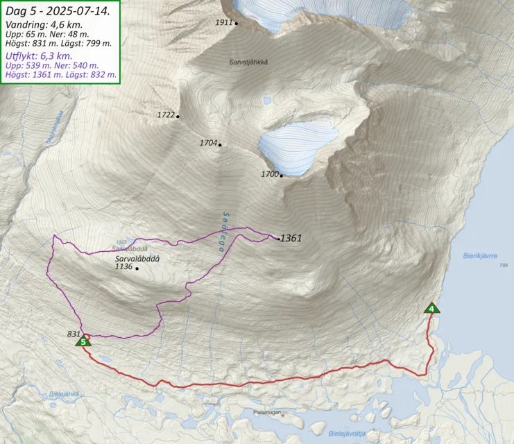 Det börjar bli dags att hitta en lägerplats och jag går mot den lilla sjön (1253 m ö.h.) nedanför västra sidan av Tjievratjåhkkå. Vid sjön fanns några platser med slät och torr flytjord att resa ett tält på. Jag sov riktigt bra här, men regnar det kan det nog komma vatten rinnande nedför sluttningen. Detta blir även vandringens högst belägna tältplats.