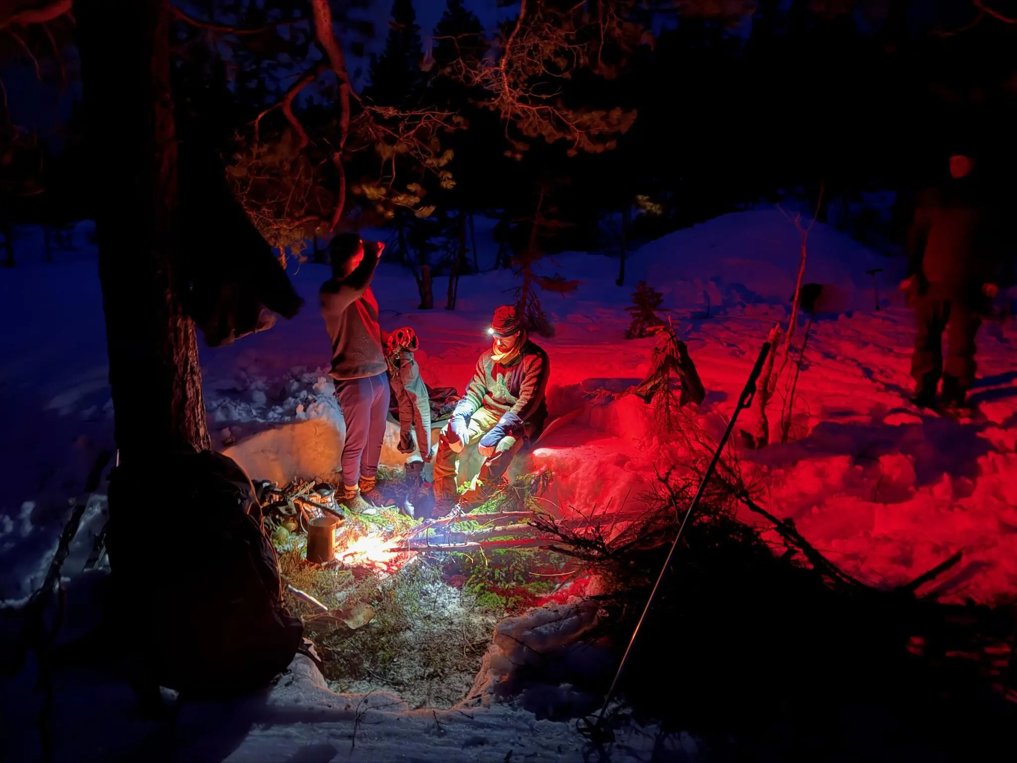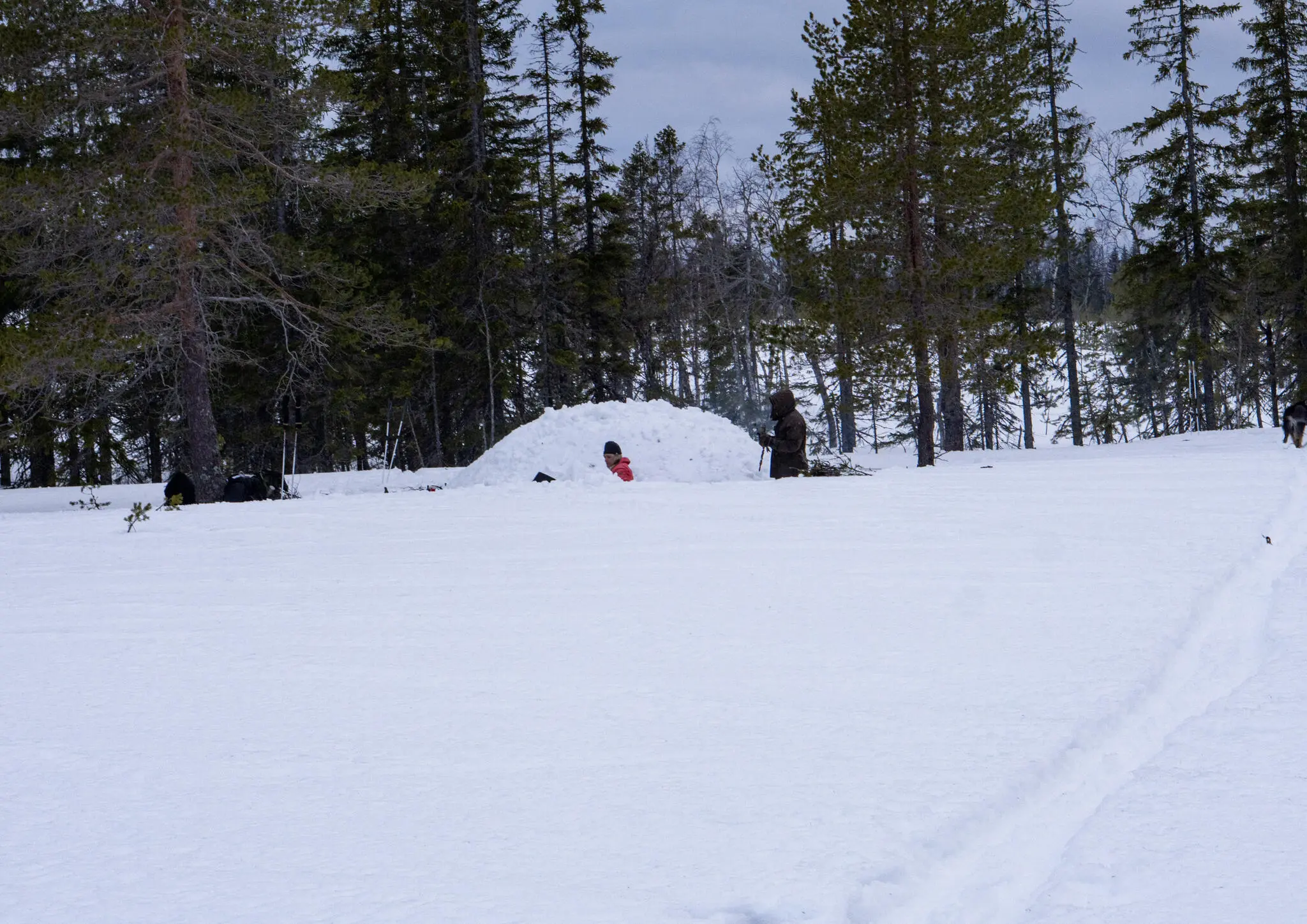 Sammantaget gissade vi att det tog fem timmar att färdigställa quinzheen. Det var ett slit och vi blev ordentligt blöta under arbetet, men vi var nöjda – inuti snöhögen, nu med ett tjockt lager granris på marken, var det väldigt behagligt och lovande inför natten.
