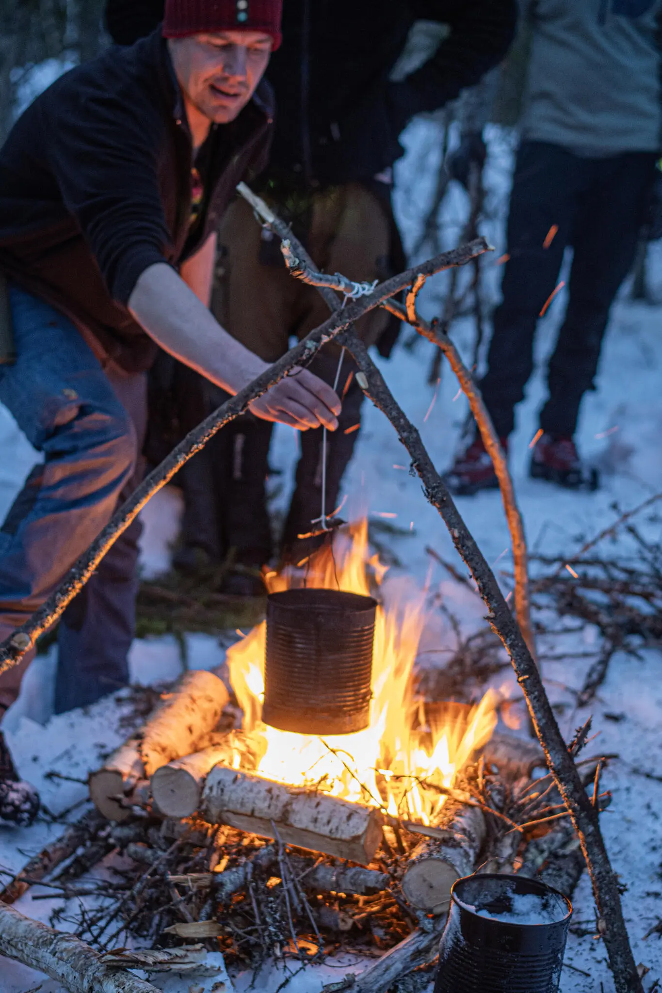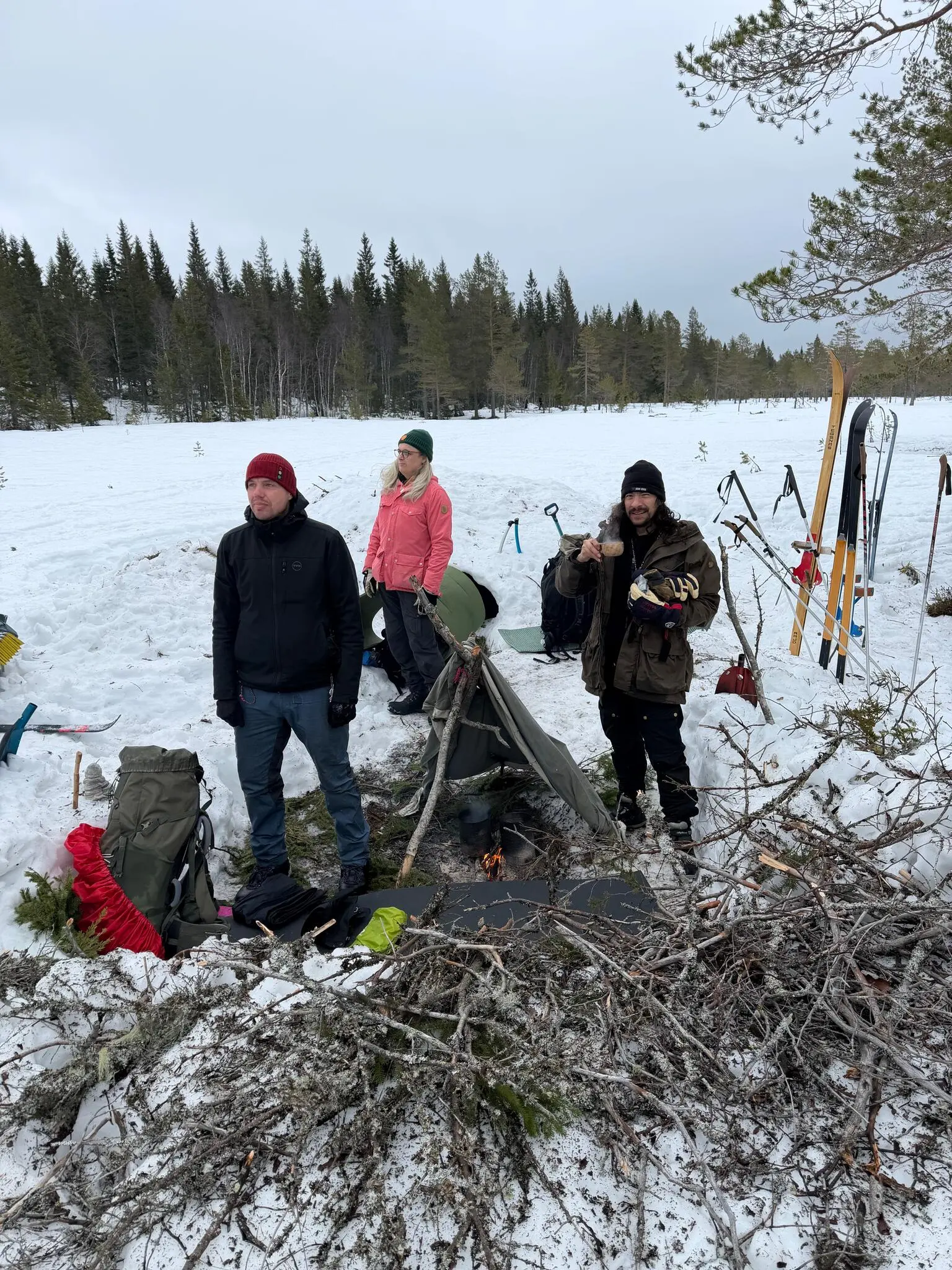 Vi behövde också se till att ha något att dricka. Att smälta snö till vatten verkar ju vara en väldigt smidig idé ända tills du testar. Dels krävs det mycket eld för att smälta relativt lite snö. Dels får vattnet lätt väldigt mycket röksmak – så mycket att du helst slipper dricka även om du är törstig.