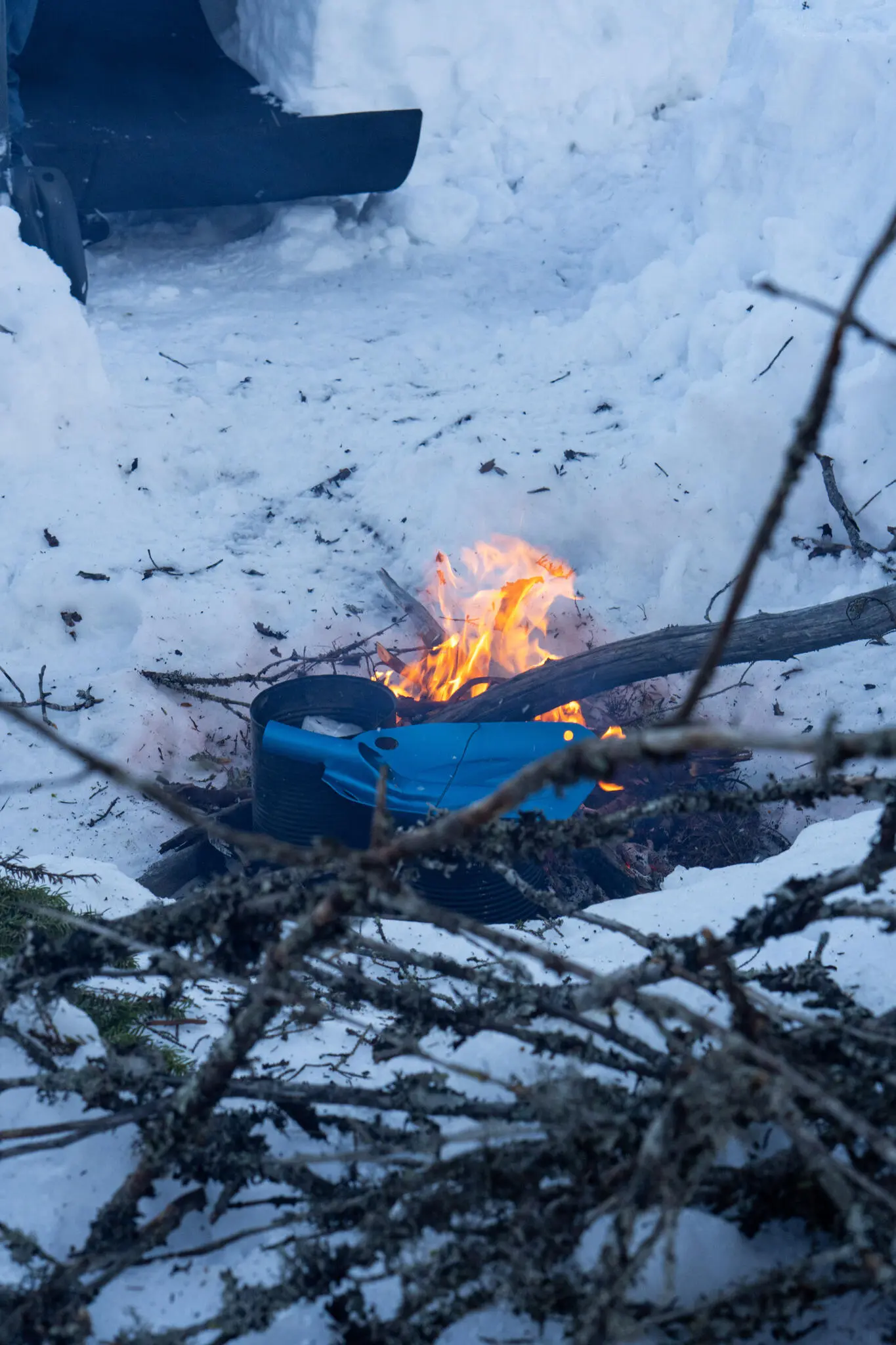 Sedan vi grävt våra vindgropar ägnade vi resten av dagen och kvällen åt eld och vatten. Trots att vi hade tur med vädret var det många plagg som hade blivit våta. Att få dem torra var en prioritet och en som krävde en hel del arbete. Kläder och eld går som bekant inte alltid perfekt ihop, något jag själv lyckades illustrera genom att ha mina kängor lite för nära elden – gummit i skon mjuknade och limningen släppte tillfälligt :( Därför behövde vi hålla uppsikt över eld och persedlar.