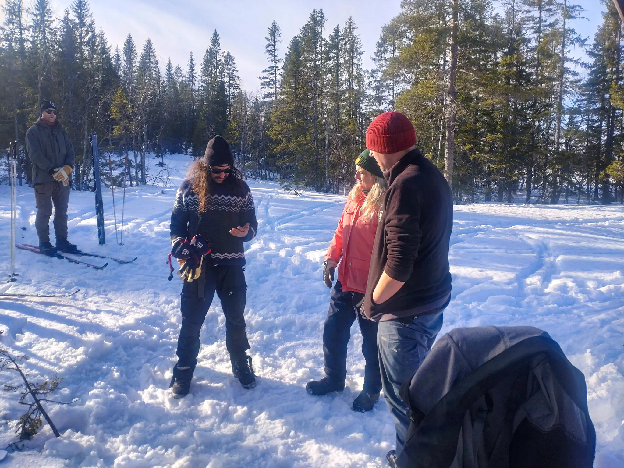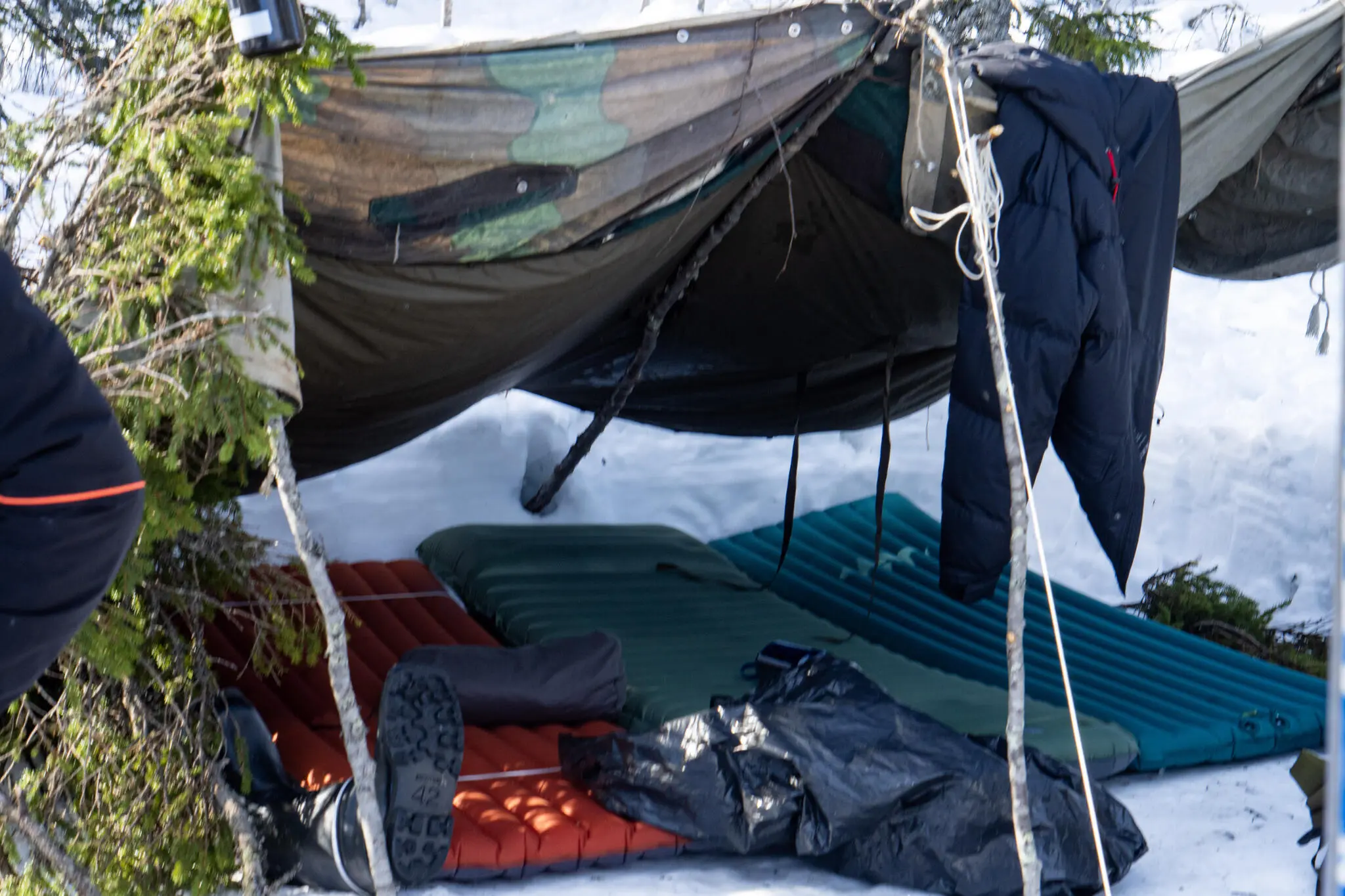Torsdag morgon fick vi ett glatt besked: vi var tvungna att stanna kvar på platsen ytterligare en natt på grund av ”dåligt väder”, något vi fick simulera eftersom solen fortsatte att envisas med att skina från en klarblå himmel. Dagen rullade på, vi ägnade oss åt att elda, hämta ved, förbättra eldplatsen, smälta snö och torka persedlar. En och annan tur till våra kurskamrater och deras läger blev det också – det var kul att se de olika val och lösningar som hade gjorts!
