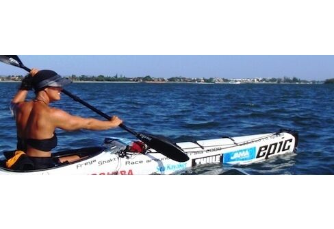 Med kajak på den Finska damens arm. Kartbilden över Finland ser nämligen ut som en kvinna med en arm, den andra hade ryssland tagit...