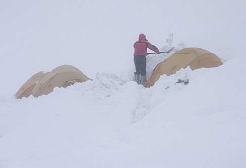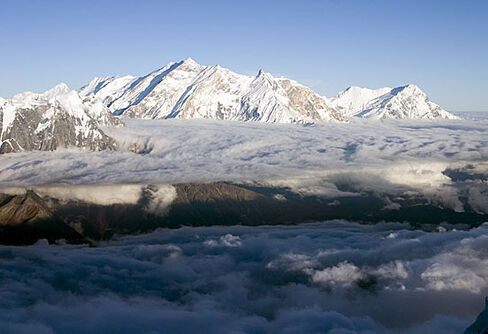 Sex dagars snöfall. Äntligen skiner solen över Dhaulagiri igen efter ett sex dagars snöfall. Snöskottningen har bytts mot glassande i solen och ...