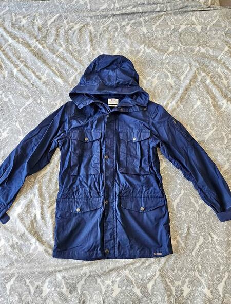 Klassiska fjällräven jackan. Använd fåtal gånger, max 5ggr sen har den hängt i gaederob. Skulle säga att den är i nyskick ännu. Finns inget slitage alls.
