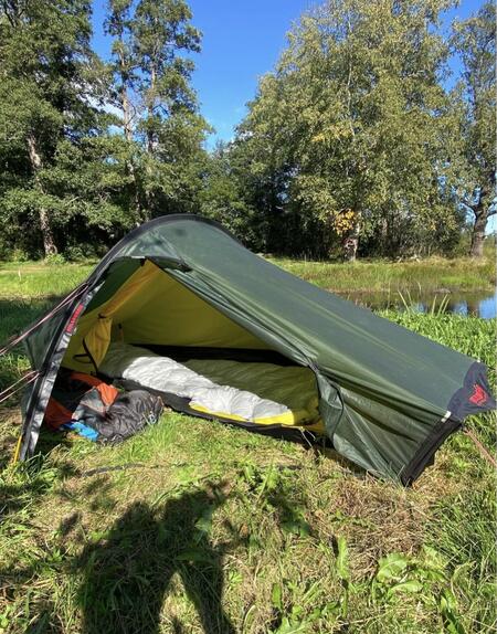 Man kan sova med ett mindre barn eller en hund eller en rätt stor ryggsäck i innertältet.