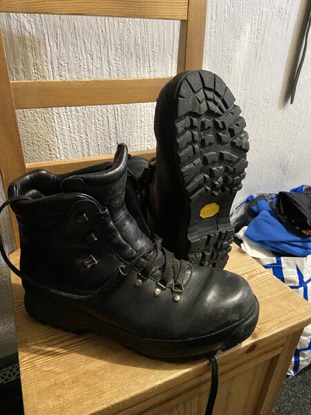 Str. 9 1/2, enligt mig strl 43. Använd och välskött känga. Skinfodrad och utan Gore-Tex. Används lämpligen med en tjockare strumpa. Nypris ca 2500 kr