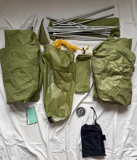 Ett oanvänt tält, Marmot Tungsten UL 1P säljes. Dock har jag provrest tältet ett par gånger men aldrig använt tältet ute på vandring. Som man kan se på bilden så är det komplett, linor, tältpinnar, stänger och reparationskit. Golvskyddet ingår!
