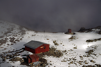 Tio minuter senare fick vi syn på något betydligt trevligare – Top Hut, den lilla stugan vid foten av Lenana. Den var låst. Ingen ranger inom synhåll. Vi lommade iväg mot en annan mindre stuga och gladdes åt att den var olåst. Stanken av ruttna grönsaker och något fränt slog emot oss med rejäl kraft. Vi städade lite och insåg omgående att den fräna doften härrörde från råttskit. Vi funderade på att slå upp tältet, men lättjan tog överhanden. Städning. Matlagning. Värmen tillbaka. Jag gick ut för att kolla vädret. Molnen skingrades och gyllene ljus spred sig över den lilla platån vid Lenanas fot. Det var då jag såg det. Berget , med stort B! En gigantisk vägg reste sig rakt upp och då det var belyst av dagens sista solstrålar kunde jag konstatera att det var bland det vackraste jag sett.