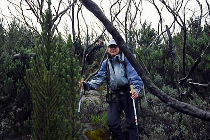 Det hade regnat nästan hela natten. Dimman låg tät då vi påbörjade vandringen uppåt. Två meter höga frökapslar och underliga klippformationer skymtade inne i det grå töcknet. Det var helt tyst. Plötsligt hörde vi röster. En uppspelt amerikansk röst. En liten hut dök upp i diset och vi vandrade dit. En glad tjej från Oregon höll låda, medan två surmulna Tjecker satt och svor över dåligt väder. En Japanska försökte lära sig Swahili av några bärare. Frukost på silverfat var på gång. Gängets guide undrade varför vi vandrade utan bärare och då vi förklarade att vi gillade den gamla alpinistklyschan - Om man inte kan bära sin egen packning, har man intet i bergen att göra. Till svar fick vi att vi inte skulle klara av att ta oss till berget. I samma andetag fick vi reda på priset på vad det skulle kosta om de bar våra grejer. Vi tackade nej och fick halvhäcklande information om att det var otroligt dumt beteende och ingen gjorde som vi. Mt Kenya var verkligen inte att leka med, punkt slut.