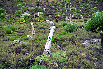 Snön försvann, vi var helt plötsligt på barmark. Halvtimmen senare dök den första vegetationen upp och efter ytterligare en någon kvart var vi omgivna av grönska, fåglar och andra smådjur. Varmare för varje minut som gick. Ett område med gräs där dussintals murmeldjur lekte. ”Metallic-blå-gröna” fåglar med enormt långa stjärtfjädrar jagade varandra. Efter den relativa kylan uppe vid Top Hut kändes det som om man återvänt till livet.
