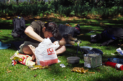 Vi gick på i rask takt och framåt eftermiddagen mötte vi ett gäng turister med ett stort följe bärare. Snabba artighetsfraser utbyttes och vi avböjde vänligt men bestämt alla erbjudanden om att få vår packning buren. Stigen blev helt plötsligt mycket sämre, men vi reflekterade inte speciellt mycket över detta. Sumpigt och lite svårt att hitta rätt. Snårigare. Hade verkligen bärarna och de minst sagt lättklädda trekkarna verkligen gått här? Vi började bli villrådiga. Vi fortsatte långsamt och spanade intensivt efter var den tidigare så fina stigen tagit vägen. En stig på andra sidan floden mitt i dalen? Det tycktes vara en där. Jag spenderade en timme på att undersöka detta. Nej, det fanns ingen stig där heller. Rådslag. Till slut bestämde vi oss för att fortsätta neråt på vad som kunde vara rutten ner mot nästa stuga. Ett regnoväder var i annalkande och det började skymma. Vi började få bråttom att hitta en campingplats. Det var inte lätt i den ömsom väldigt steniga, ömsom sumpiga terrängen. Dessutom hade vi inte mycket vatten kvar. På en liten rygg hittade vi till slut två relativt platta och torra plättar som dög. Var var vi och vart skulle vi ta vägen? Vi hittade vatten i en sorts växt som vi upptäckte kunde rymma litervis med regnvatten. Nedstämdheten började göra sitt intåg, men jag kände ändå att situationen också var lite spännande. Just innan mörkret föll påstod sig Nadine se något långt borta på en trädbeväxt bergsrygg. Det såg ut att vara en stuga av något slag. Då mörkret föll såg vi ett svagt ljussken långt borta i mörkret. Allt skulle säkert ordna sig under morgondagen.