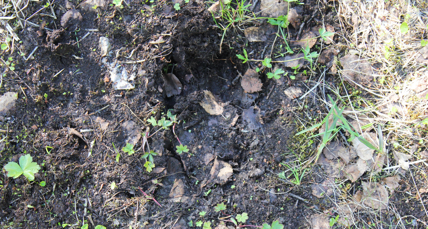 Nere i skogen ser vi gott om tecken på djur. Älg, ren och stora fåglar. Allt är frid och fröjd tills vi återigen springer på det här - vad vi tror är björnspår (?). Eftersom att bladen som ligger i spåret inte är blöta tror vi att spåret är gammalt, samtidigt som pulsen stiger av vetskapen att björn har varit här.