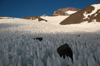 penitentes. Penitentes är spetsar av snö som byggs upp när solen står