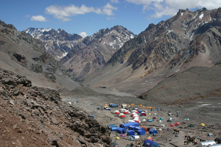 Äntligen kommer vi så fram till vårt basläger, Plaza de Mulas. Aldrig mer behöver vi bära så här tungt. Från och med nu går vi upp och lämnar mat och utrustning redan dagen innan.