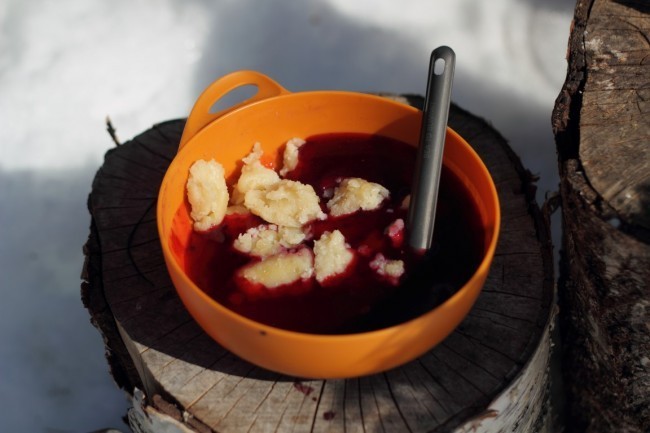 En riktigt god efterrätt som du kan förbereda på flera sätt om du ska på dagstur: förbered allt hemma, dvs stek pannkaka och gör soppan som du har i termos, eller så väljer du att bara förbereda smeten. Du kan även blanda en färdig mix i påse med ägg- och mjölkpulver.