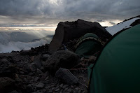 Vinden piskar och molnen drar snabbt in över oss. Utsikten mot alla femtusenmeters toppar försvinner och efter några minuter är himlen mörk. Inne i tältet förbereder vi oss för morgondagen och vår fortsatta vandring mot toppen. (Detta är ett utdrag ur dagboken från del 1 i projektet Chile - Bergslandet.)Vi har slagit läger på en klippavsats på väg mot vulkanen San Josés topp. Detta är det andra av tre läger mellan vår startpunkt på 2600 meter och den 5800 meter höga toppen. Överallt runt omkring oss är det sten och jag ser höga berg i alla riktningar. Det är en inspirerande men väldigt krävande miljö att fotografera i. Jag har huvudansvaret för stillbildsfotograferingen, men långa stunder är jag alltför trött för att ta bilder. Även om jag medvetet rör mig långsamt, gör den tunna luften över fyratusen meter att det känns väldigt jobbigt. Andningen är ansträngd och hjärtat slår snabbare än på havsnivå.