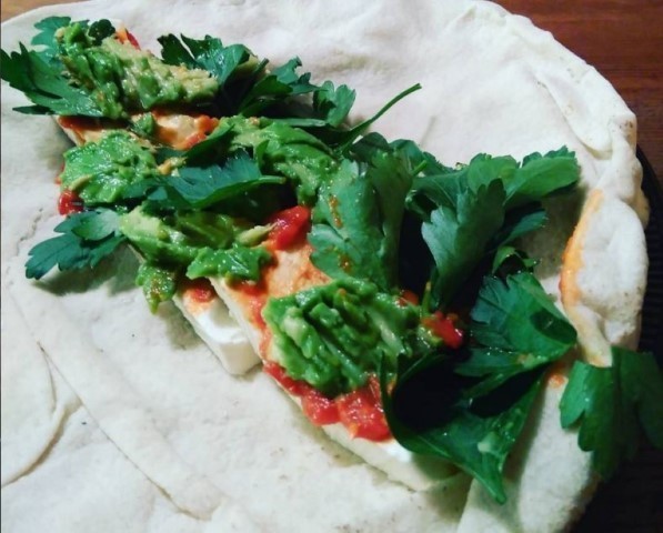 Du lägger alla ingredienser på brödet och rullar ihop.