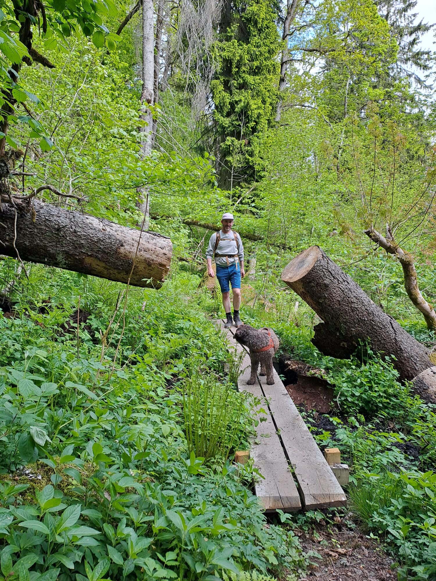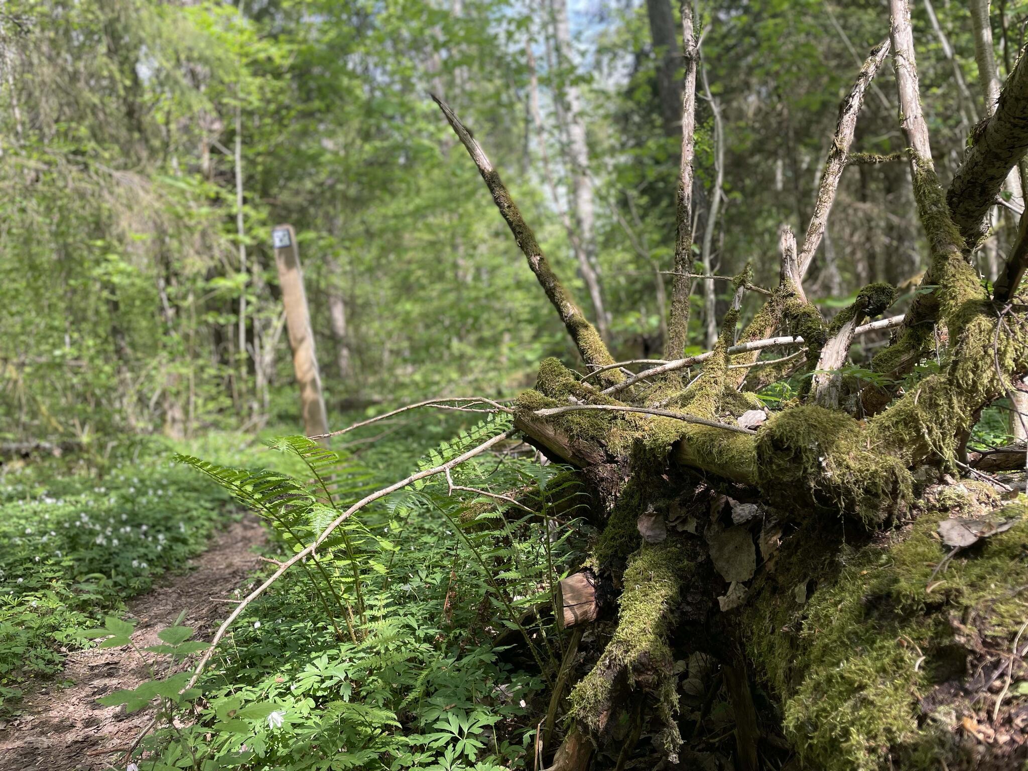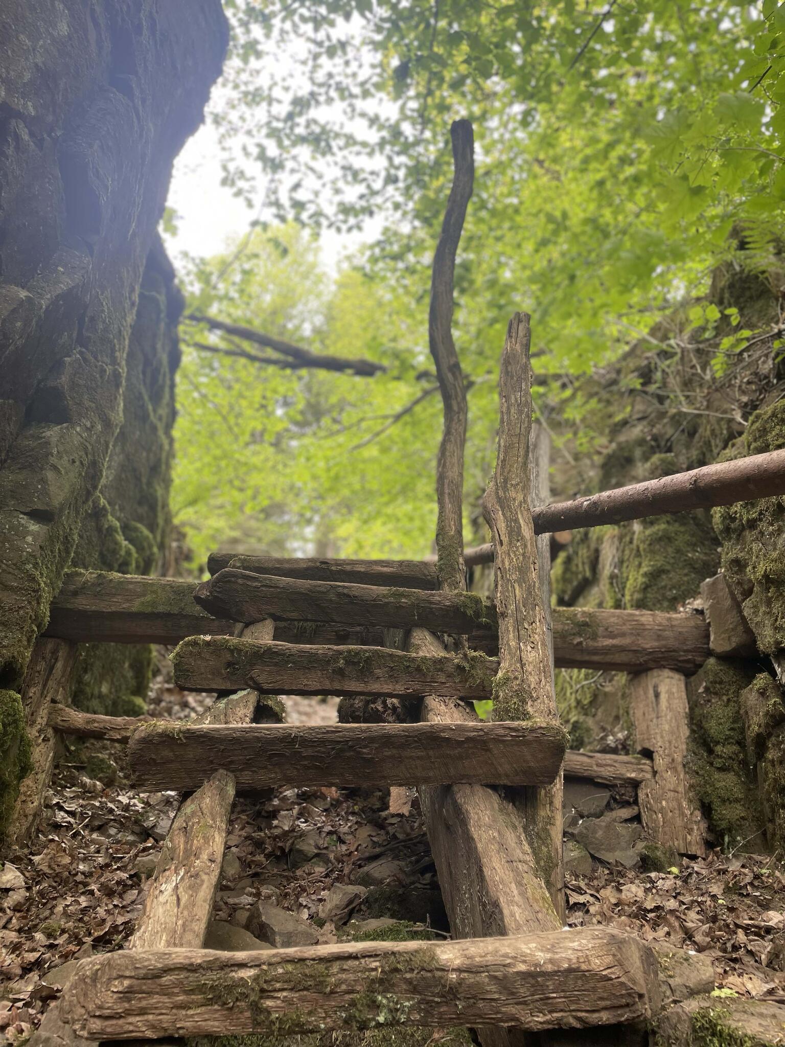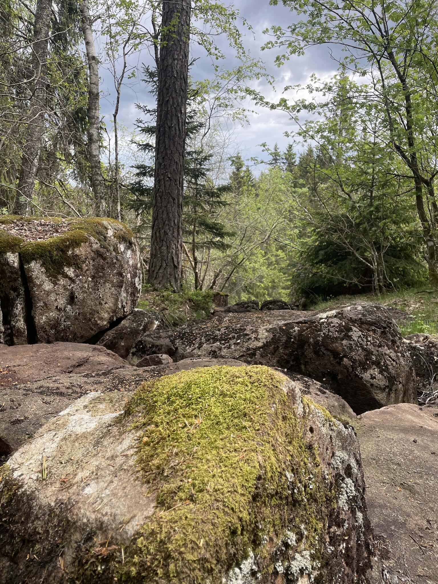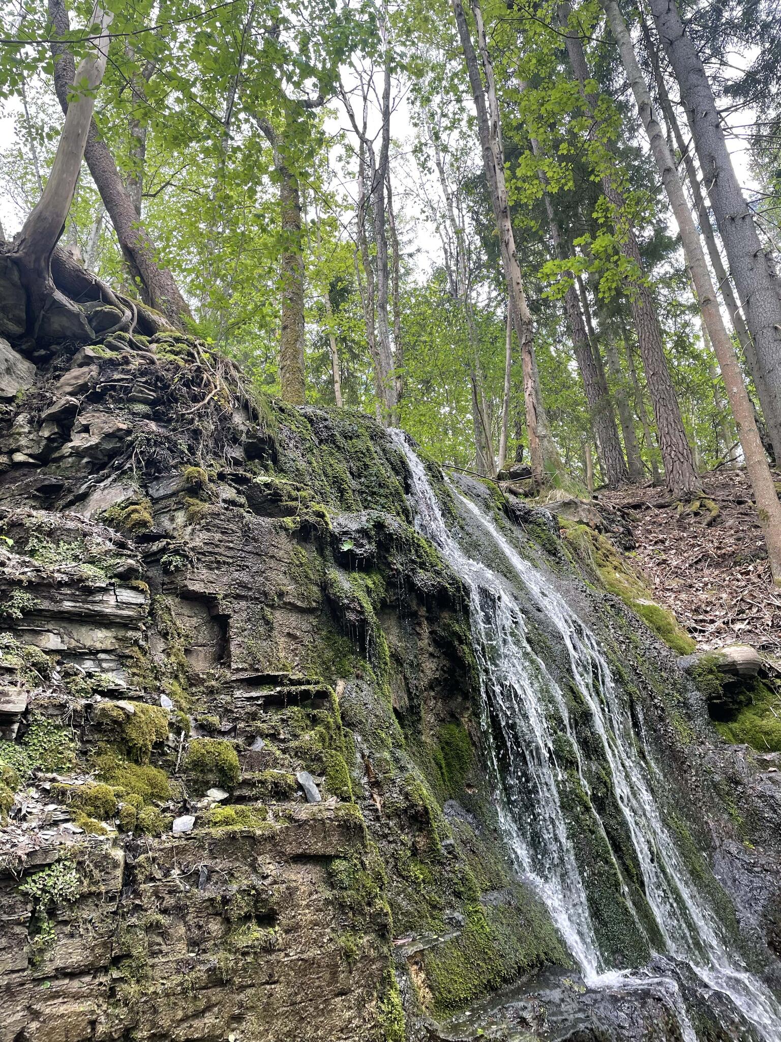Sen fortsätter vi neråt igen, in i gammalskogen. I skuggan av bergets brant balanserar vi över fallna stammar, följer smala stigar genom tät granskog där ljuset filtreras i grönt. Därefter börjar leden stiga igen, och vi går ovanför Siggefallet – ett litet men karakteristiskt vattenfall som ofta torkar ut under sommaren men ändå ristat sitt spår genom lagren.