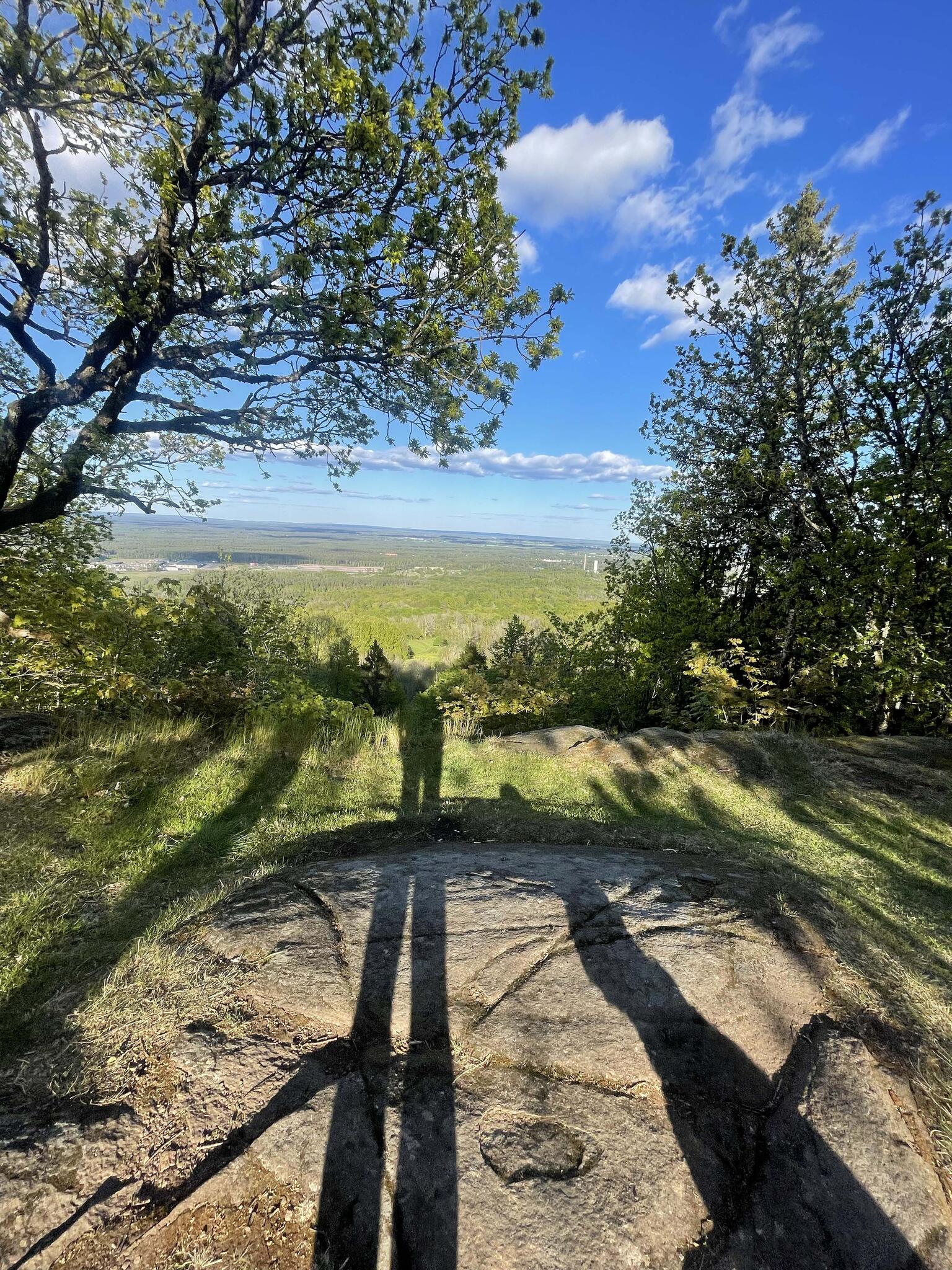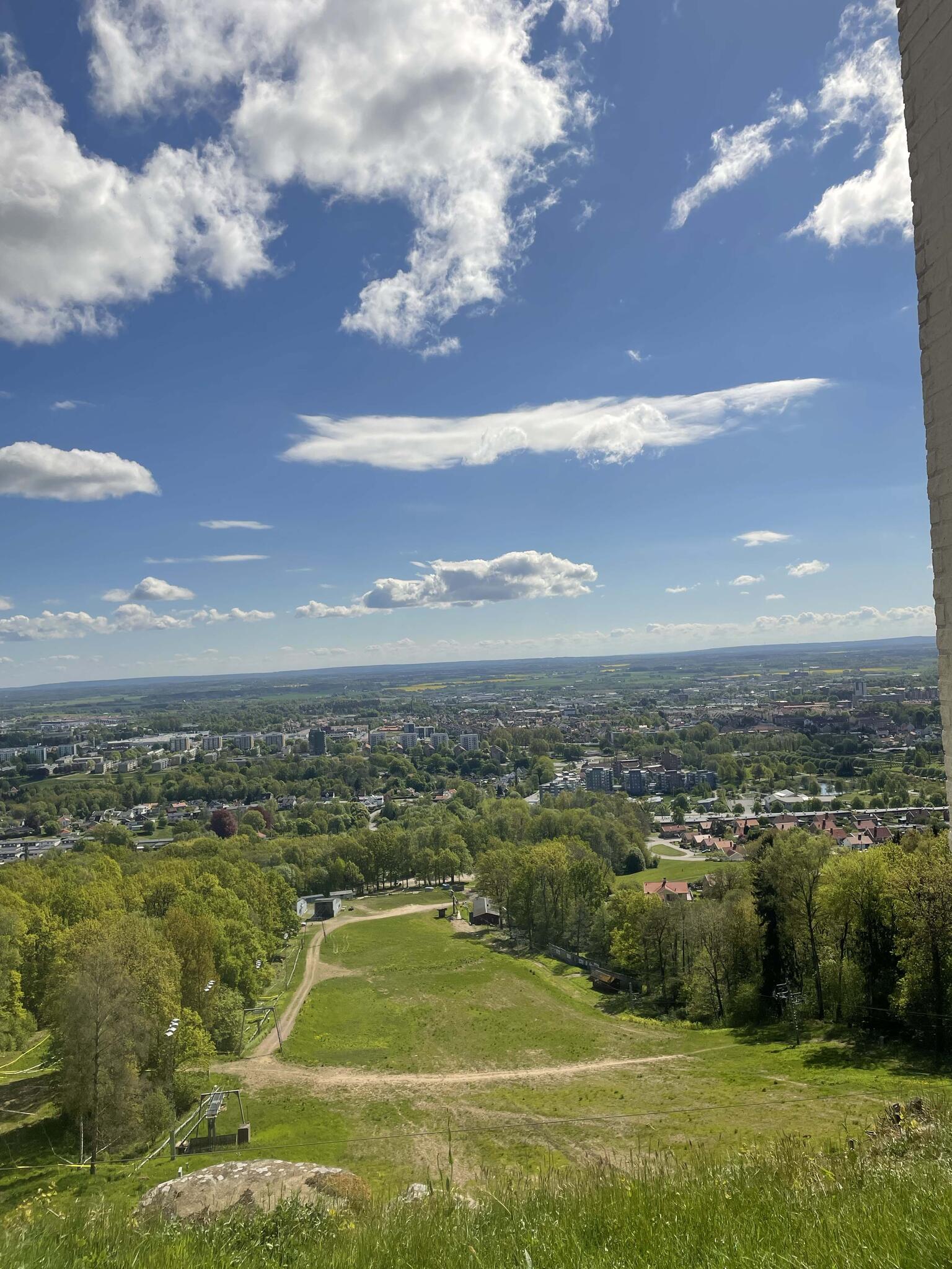 Vid Skultorps Nabbe når vi en utsiktsplats och äter lunch. Vyerna sträcker sig över landskapet, över stadsdelar, skogar och åkrar. Här syns hur Billingen omfamnar Skövde – och hur den branta kanten mot öster avbryter platåns annars mjuka form.
