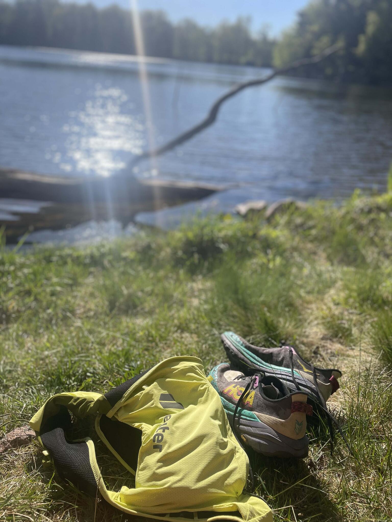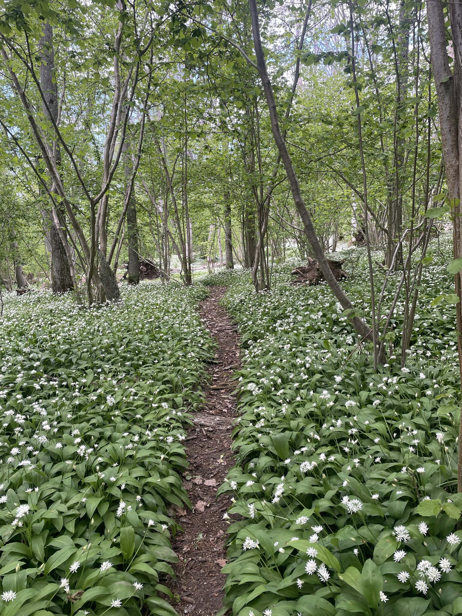 Snart får vi utsikt över sjön Lången. Terrängen är kuperad men löpvänlig. Vi springer genom lövskog, genom ett hav av ramslök, över öppna fält och in i hagar. Det blir snart en vana: öppna grindar, stänga dem försiktigt, se till att Rut är med.