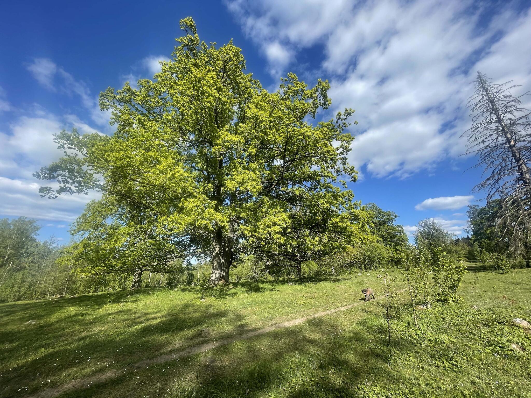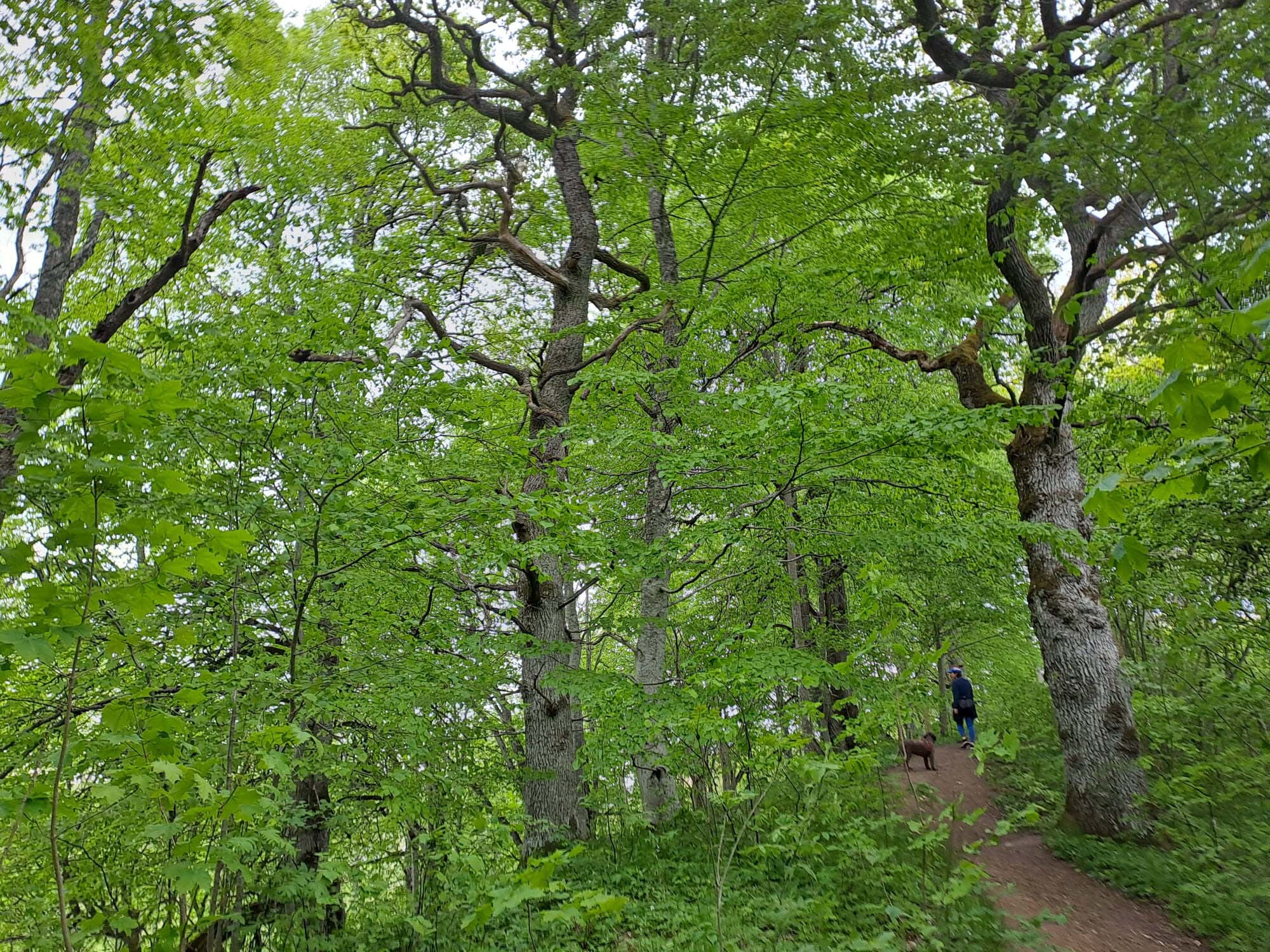 Efter maten passerar vi genom hagmarker, över golfbanans klippta ytor, där leden känns nästan surrealistisk. Det är som att vandra mellan världar: från gammelskog till fairway på några minuter.